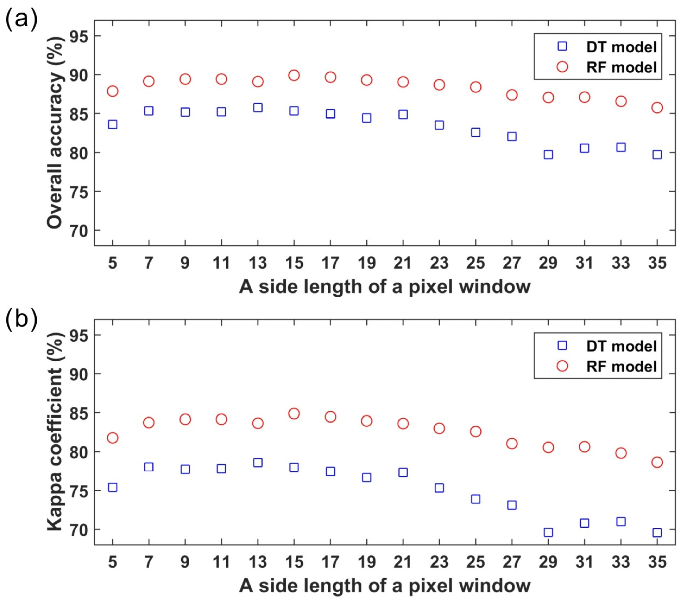 The variations of the overall accuracy and the kappa coefficient for the DT and RF model that were developed using the polarimetric parameters and their texture features based on a pixel window, ranging from 5–35: (a) the variations of the overall accuracies; and (b) the variations of the kappa coefficients.