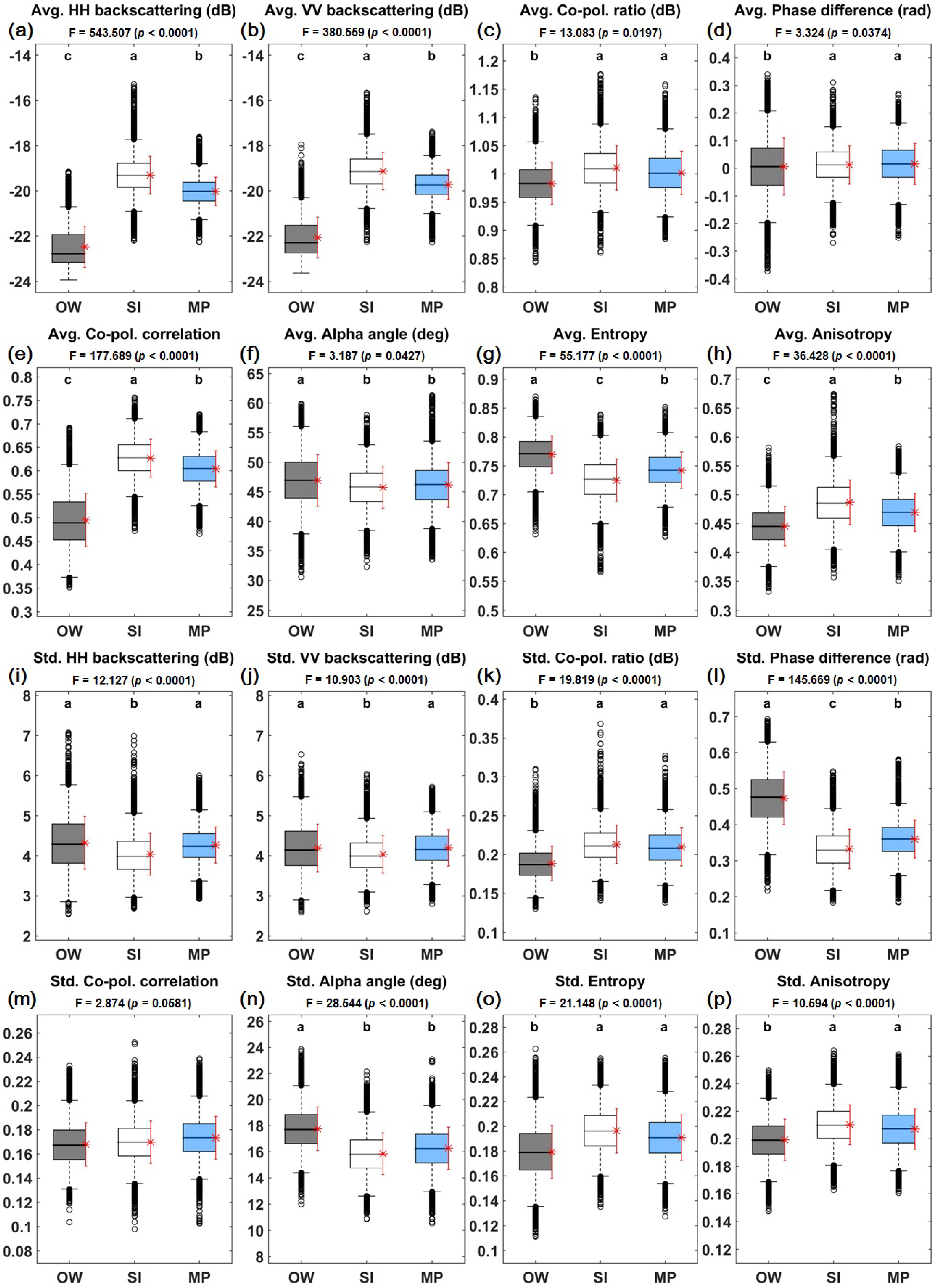 The boxplots in Figure 3 show the characteristics of the polarimetric parameters in the samples of open water, sea ice and melt pond. The F-statistic and p-value in each boxplot were derived from the one-way analysis of variance (ANOVA) at the 95% confidence level. The p-values below 0.05 mean that at least one surface type can be distinguished from the other surface types by the polarimetric parameters. Tukey’s post hoc test at the 95% confidence level was carried out to identify which surface types can be discriminated from other surface types by a specific polarimetric parameter. The results of the post hoc tests are presented in each boxplot. Two surface types that cannot be discriminated from each other by the post hoc tests are denoted by the same lower case letter. The group names of the results of the post hoc tests are ordered according to the mean value of the samples. The ANOVA with post hoc tests was carried out using 300 randomly-selected samples (100 samples for each surface type) from a total of 37,152 samples (12,384 samples for each surface type), because the large sample size can overestimate the F-statistic, flagging the minute differences between the surface types as statistically significant. The sample size of 300 was determined by power analysis for one-way ANOVA with three groups conducted in G*Power [72] using an effect size of 0.25, an alpha of 0.05 and a power of 0.95.
