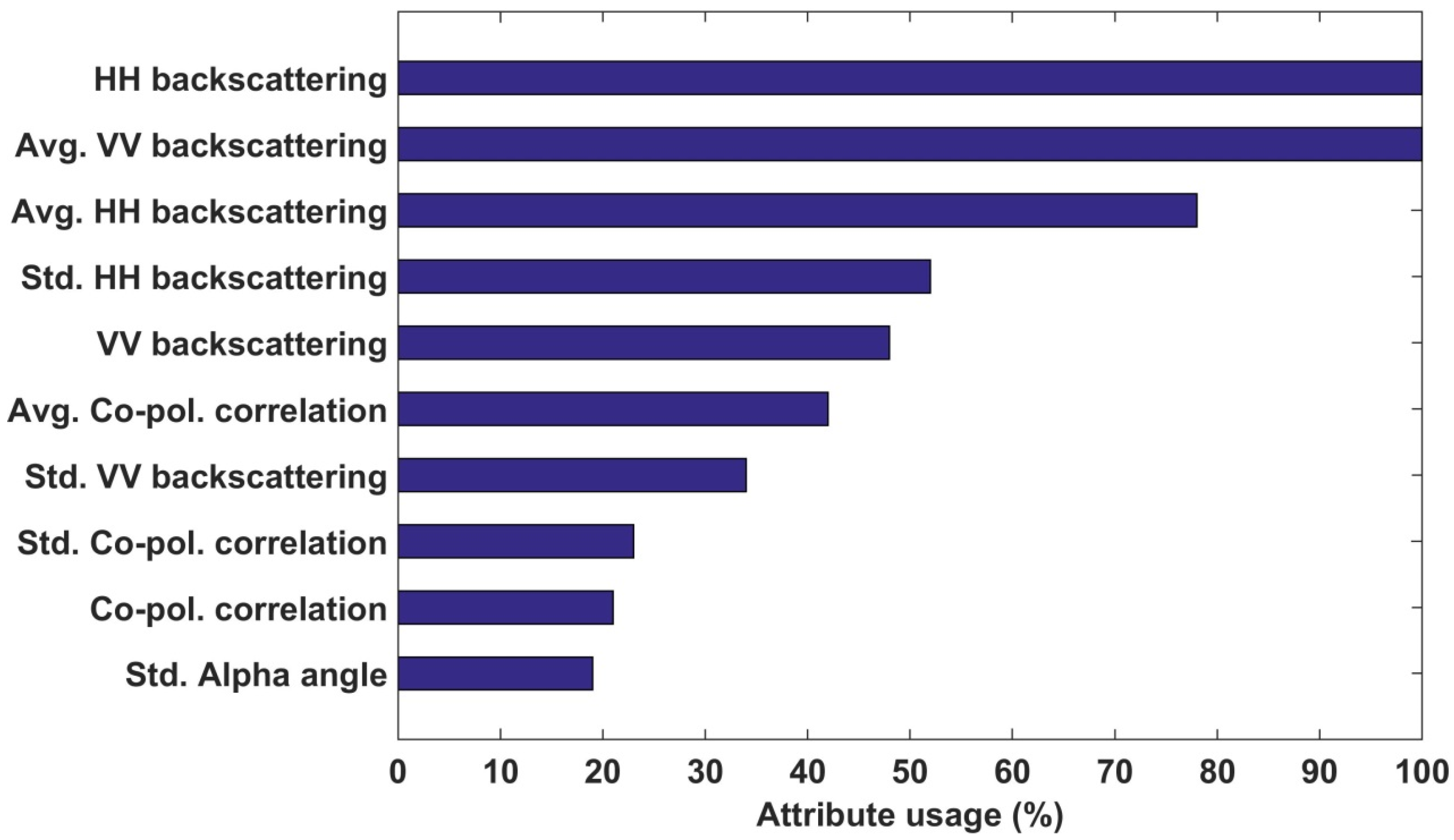 Attribute usage of the DT model that was developed using the polarimetric parameters and their texture features based on a 15 × 15 pixel window.