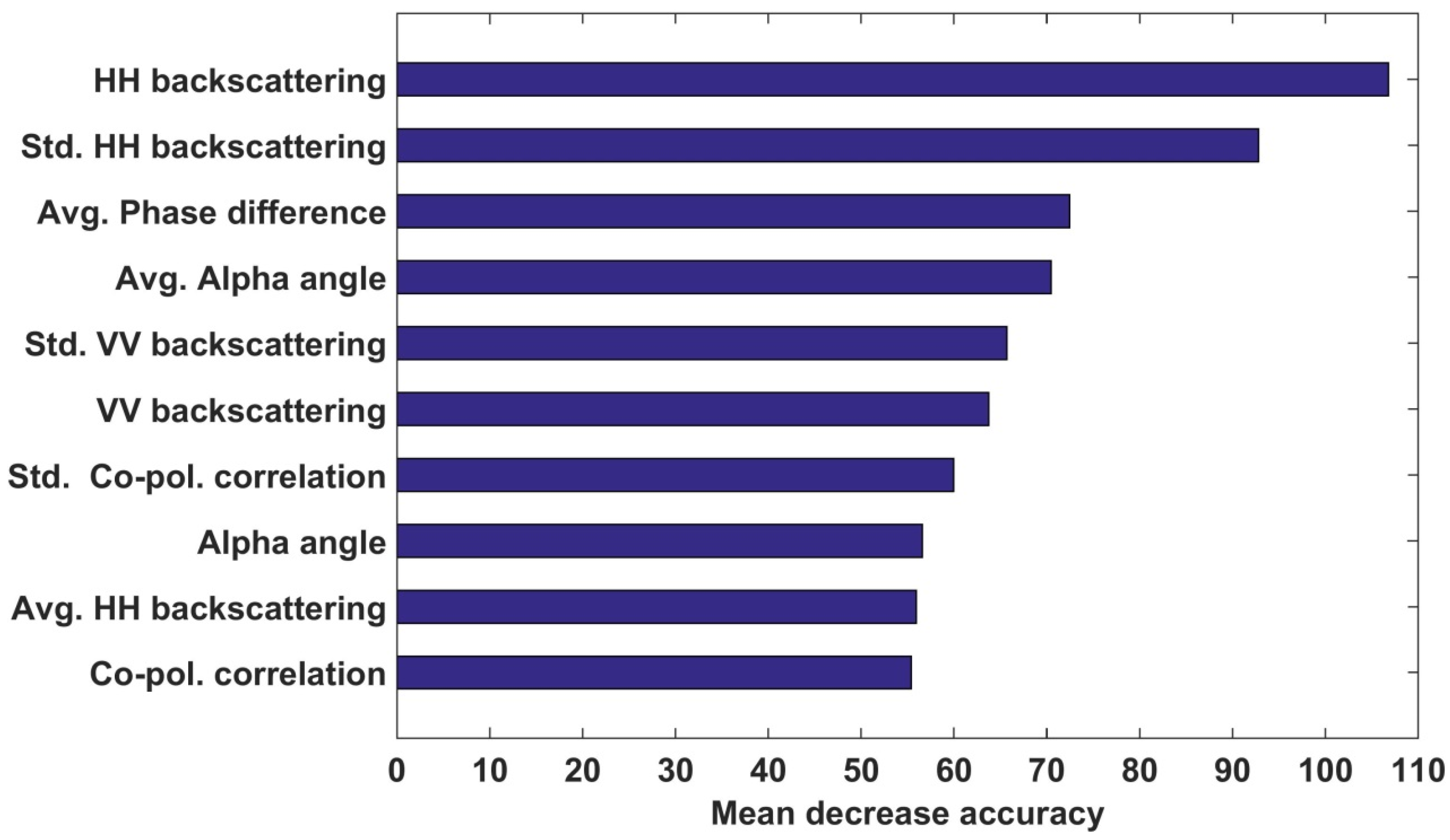 The relative importance of the variables ranked in the top 10 most important variables for the DT and RF models is shown in Figure 6 and Figure 7, respectively. The HH backscattering coefficient was used as the most important variable in both models. The HH backscattering coefficient would be used for the discrimination of sea ice from open water and melt ponds based on the difference of surface roughness under low wind speed conditions [73,74]. In the DT model, the average of the VV backscattering coefficients was also used as the most important variable, and the average of the HH backscattering coefficients was the next important one (Figure 6). The melt pond samples of the average of the backscattering coefficients showed much higher values than the open water samples due to the strong backscattering signals from the surrounding sea ice, but smaller values than sea ice samples (Figure 5). Therefore, the average of the backscattering coefficients in a mid-incidence angle would contribute to the distinction between melt ponds on multiyear ice and open water. The standard deviation of the HH backscattering coefficients in a mid-incidence angle was identified as the second important variable in the RF model (Figure 7), which would contribute to separation of sea ice from open water and melt ponds. The average of the co-polarization phase difference and the alpha angle in a mid-incidence angle were also identified as the important variables in the RF model, which was possibly used in order to distinguish melt ponds on multiyear ice from open water. The average of the co-polarization correlation, entropy and anisotropy and the standard deviation of the phase difference in a mid-incidence angle showed a significant difference between melt ponds and other surface types, but their contributions to the machine learning models were relatively low. This would be because the melt pond samples showed much more distinct characteristics from open water for the texture features of the HH and VV backscattering coefficients compared to other input variables derived in a mid-incidence angle (Figure 5).