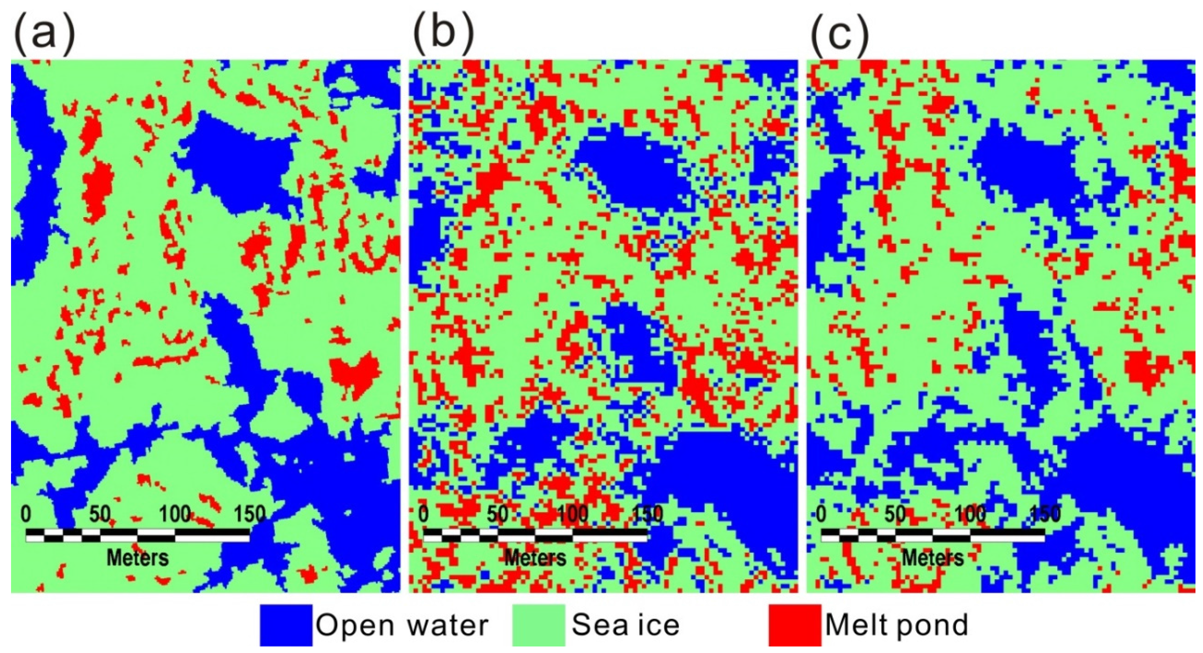 The statistics for melt ponds were computed for a 50 by 50 pixel window of the 2011 TerraSAR-X data using the RF-derived melt pond map and gridded at a 150-m grid size (Figure 11). The values of sea ice concentration were close to 100% in the areas of the multiyear ice floes, while less than 90% in the areas of the heavily-melted ice fragments (Figure 11a). The melt pond fractions on the heavily-melted ice fragments were less than 10%, while those on the multiyear ice floes varied from 10%–28% (Figure 11b). The higher melt pond fractions on the multiyear ice floes were attributed to a larger fraction of ice [28]. The number density and the mean area of melt ponds were estimated as ~3800 km−2 (Figure 11c) and ~120 m2 (Figure 11d), respectively, in the areas of both the multiyear ice floes and heavily-melted ice fragments. However, again, note that the number density and mean pond area obtained by the RF model would be inaccurate, because the narrow and small melt ponds (less than 9 m2 in size) would not be detected due to the spatial resolution of the TerraSAR-X data.