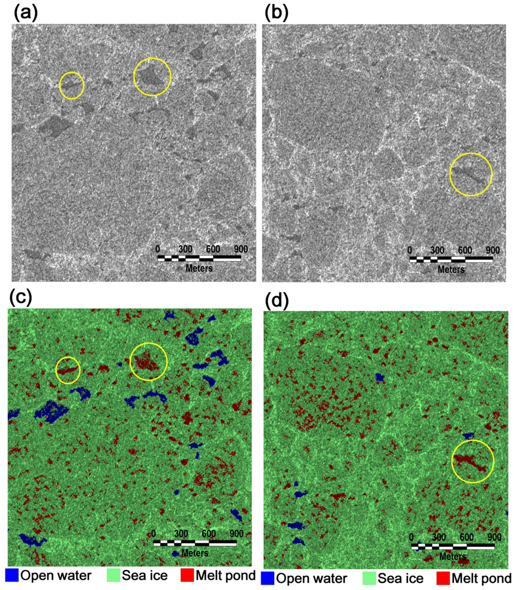 Since the RF-based melt pond retrieval model using the polarimetric parameters and their texture features based on a 15 × 15 pixel window performed better than the other machine learning models, it was applied to the TerraSAR-X dual polarization data obtained on 21 July 2010. As there was no reference data of melt ponds available over the area of the 2010 TerraSAR-X swath, the melt pond mapping result of the RF model was visually assessed in comparison to the amplitude image. Figure 9 shows comparisons between the amplitude images and melt pond mapping results. The melt ponds and open water detected from the RF model showed close agreement with dark areas observed in the amplitude images. The RF model detected most of the dark and small areas as melt ponds, with discrimination of large and dark areas as open water. Some melt ponds were identified by the model in dark areas of a large size, which appeared as open water (yellow circles in Figure 9). Although it is not clear whether the large and dark areas of the amplitude images are actual open water, it might be possible to say that the RF model did not produce as high performance for melt pond retrievals from the 2010 TerraSAR-X data as that from the 2011 ones, because it would be biased to the 2011 TerraSAR-X data and might not work well for the different sea ice and weather conditions.