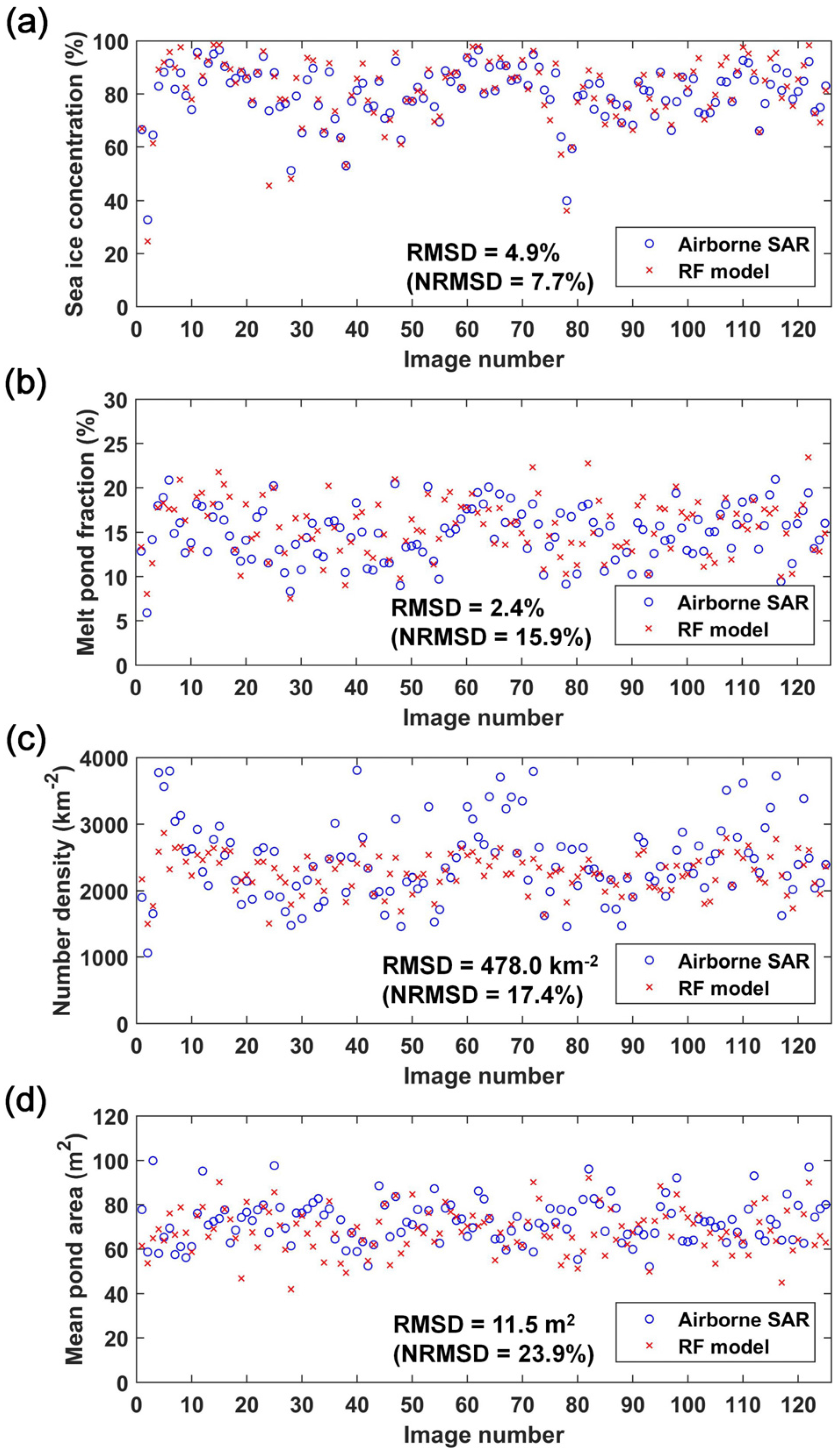 The comparison between the airborne SAR- and the RF model-derived statistics for melt pond and sea ice: (a) sea ice concentration; (b) melt pond fraction; (c) number density of ponds and (d) mean pond area. NRMSD, normalized RMSD.
