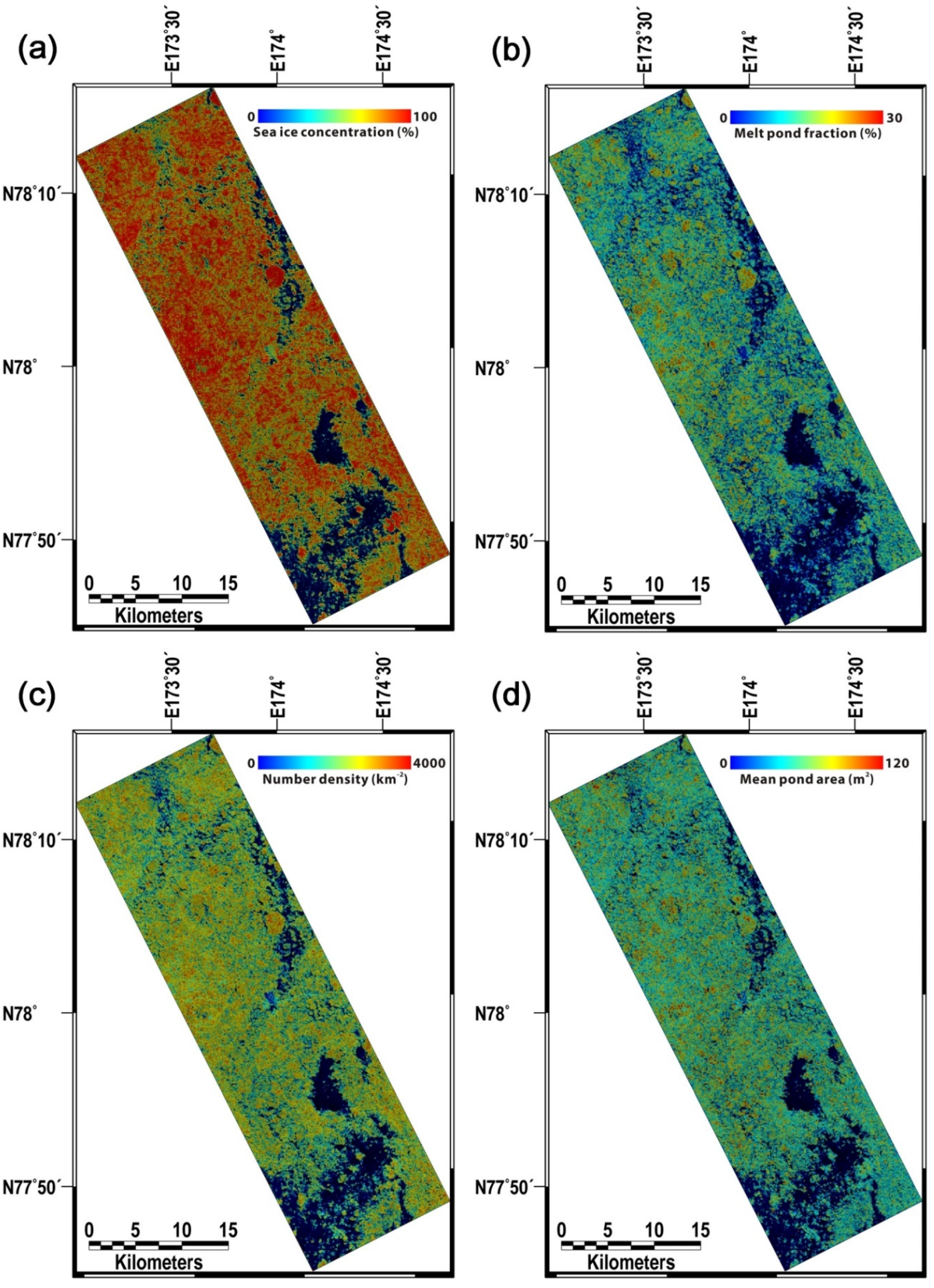 Maps of the statistics for melt pond and sea ice generated from the RF model-derived melt pond map: (a) sea ice concentration; (b) melt pond fraction; (c) number density of ponds; and (d) mean pond area.