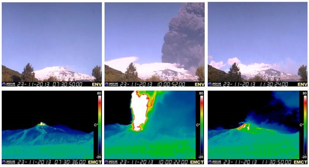 Different phases of the 23 November 2013 lava fountain event seen by the visible camera (upper panels) and the thermal camera (lower panels) of the Istituto Nazionale di Geofisica e Vulcanologia, Osservatorio Etneo (INGV-OE) video-surveillance system located in Nicolosi and Monte Cagliato, respectively.