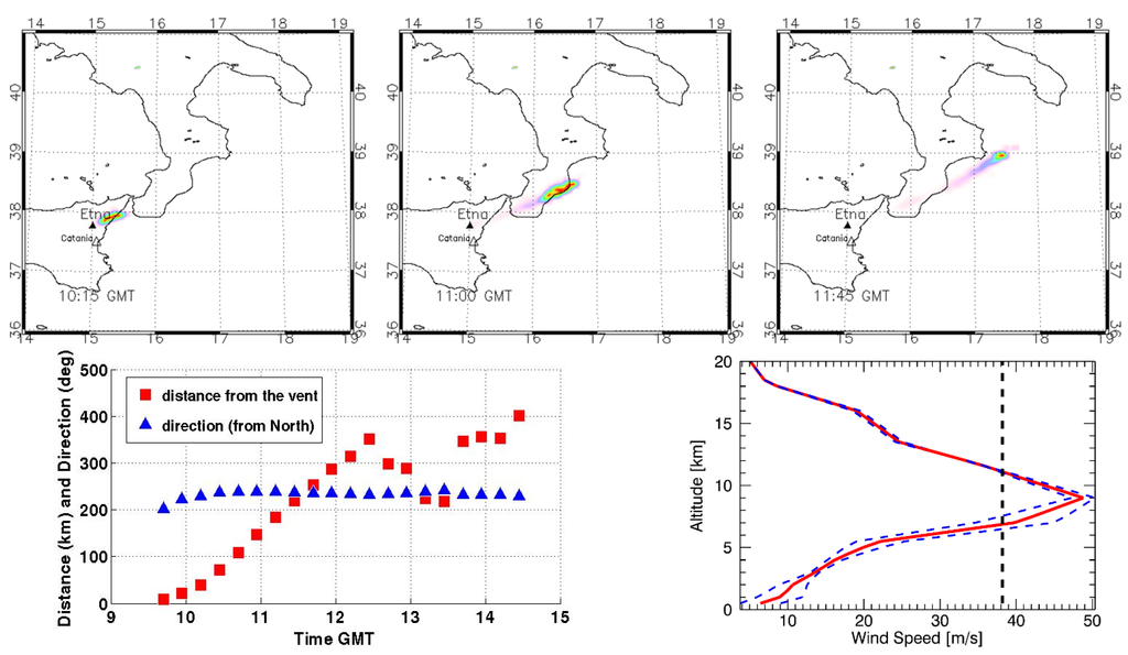 Top panels: ash cloud centre of mass at different times. Bottom left plot: distance (red squares) and direction (blue triangles, defined as the direction from which the wind was blowing) of the volcanic ash cloud centre of mass considering the different SEVIRI images. Bottom right plot: comparison between the wind speed retrieved (vertical dashed line) with the National Centers for Environmental Prediction (NCEP)/National Center for Atmospheric Research (NCAR) mean wind speed profile extracted in the area occupied by the volcanic cloud (red solid line). The dashed blue lines represent the standard deviation of the mean NCEP/NCAR wind speed profile.