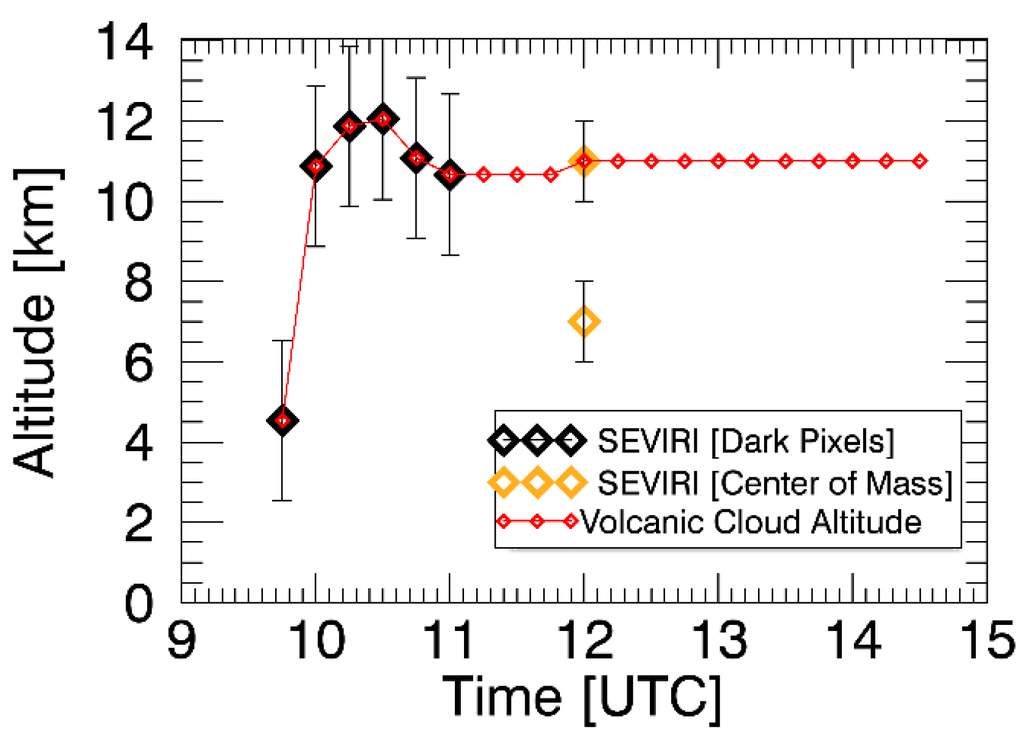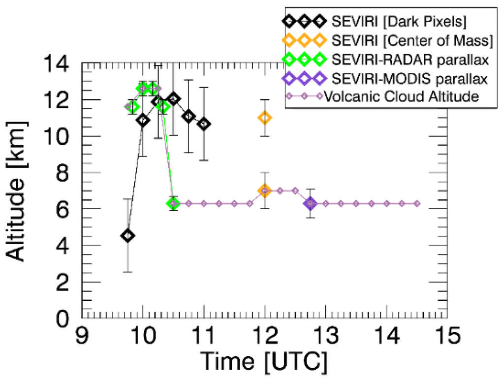 Figure 3 summarizes the results of the volcanic cloud altitude obtained using the two approaches described above and applied to SEVIRI data. Dark pixels were found in six images (09:45, 10:00, 10:15, 10:30, 10:45 and 11:00 UTC) (see the black diamond symbols), and the volcanic cloud altitudes retrieved from the centre of mass tracking were not the same as the two results found at about 7 and 11 km (see the orange diamond symbols). The retrieval errors were computed from the standard deviation of the brightness temperature obtained from the dark pixels and from the standard deviation of the mean NCEP wind speed.