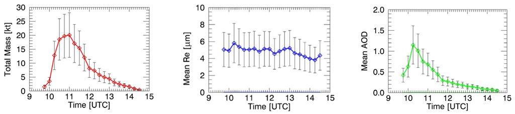 These altitude values were used to compute the ash parameters (Ma, Re and AOD). Figure 4 shows the total ash mass, the mean effective radius and the mean aerosol optical depth for the series of SEVIRI images. For each image, the total ash mass (t) was obtained by adding all of the pixels’ ash masses (computed by multiplying the pixel ash mass loading (t/km2) by the pixel size (km2)), while the mean effective radius and mean aerosol optical depth are the mean values of the Re and AOD maps. The error bars are derived from Wen and Rose [] and Corradini et al. [].