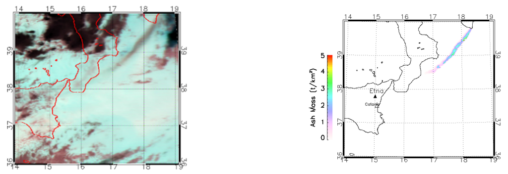 The VPR procedure was designed for simultaneous real-time retrieval of volcanic ash and SO2 cloud parameters from TIR data. The volcanic cloud top altitude is the only input required at run time. The VPR method is easy to use and useful for monitoring active volcanoes, giving fast and reliable results []. The most time-consuming computations are anticipated in a preliminary phase during which the procedure is set-up for a given location (pressure, temperature and humidity profiles), surface characteristics (temperature and emissivity), ash type (refractive index and size distribution), volcanic cloud geometry (altitude and thickness) and sensor (response function). In this work, the Volz ash type [] and log-normal size distribution were considered. The VPR procedure starts with the computation of a new image by replacing the radiance values in the region occupied by the plume with those obtained from a simple linear regression of the radiance outside the edges of the plume. The linear regression is performed considering the different surface contributions (these being clear sea, clear land or cloud) if land-sea and cloud masks are available. Thus, once the plume is removed, the new virtual image obtained shows an estimation of what the sensor on the satellite would have seen if the plume were not present. The two images, the original and the virtual one generated by removing the plume, allow estimation of plume transmittances for the TIR bands centred at about 11 and 12 μm (SEVIRI Channel Nos. 9 and 10, MODIS Channel Nos. 31 and 32) from which Re and AOD are retrieved. Finally, the ash mass is computed using the Wen and Rose [] simplified formula. Within the APhoRISM project, an improved VPR version was developed to retrieve plume transmittance. In this improvement [], the layer of atmosphere above the ash cloud is considered, as well as the thermal radiance scattered along the line-of-sight of the sensor.