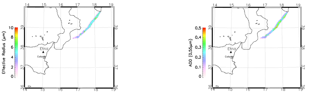 In this work, the measurements from the MSG-SEVIRI and Aqua-MODIS satellites were used to retrieve volcanic ash cloud parameters (Ma, AOD, Re) using the volcanic plume removal (VPR) algorithm [,].