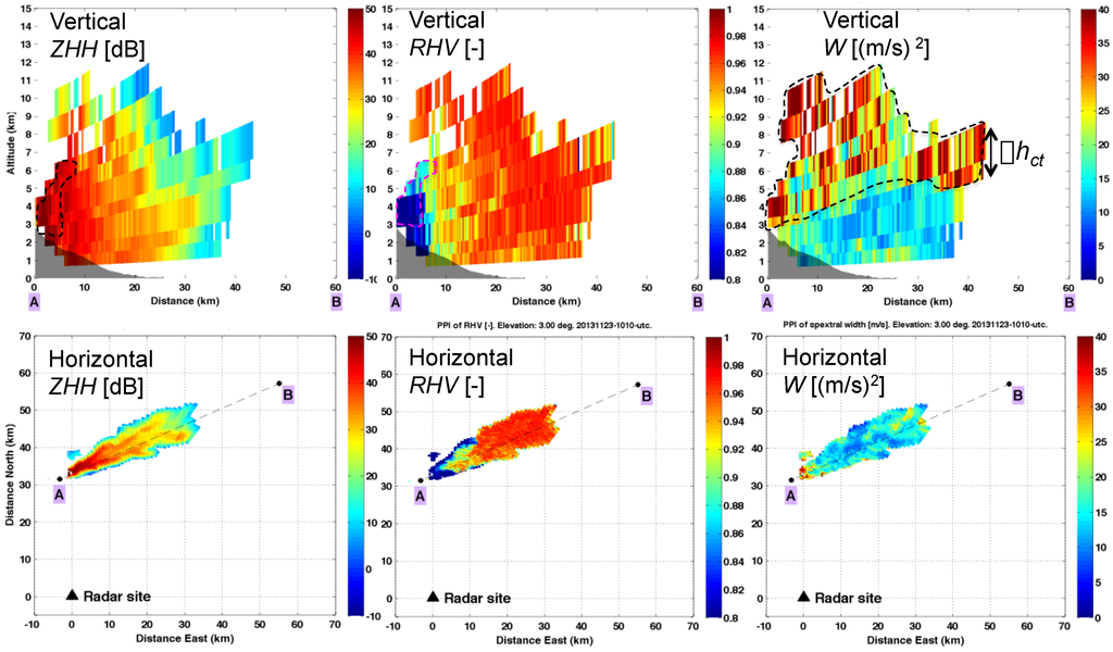Upper panels: vertical cross-sections, along the prevailing wind direction A–B, of the radar variables used in this work sampled at 10:10 UTC on 23 November 2013 from the DPX4 radar in Catania (Sicily, Italy); lower panels: horizontal radar maps at a 3° radar antenna view angle from the horizon. The dashed lines in the top left and middle panels highlight the areas probably affected by particle updraft, whereas the area contoured in the top right panel marks the region most affected by cross winds.
