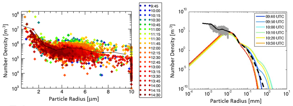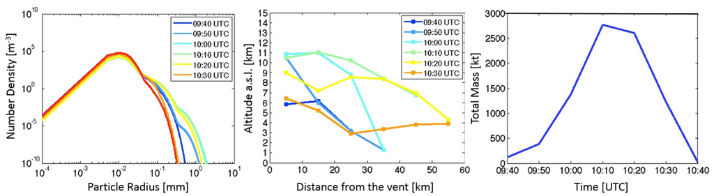 The quantification of particle size distribution is shown in Figure 7, left panel, in terms of the number density distribution. The particle size distribution retrieved by the radar is in units of number of particles·m−3·mm−1, while the number density distribution is expressed in number of particles·m−3. The number of particles per unit of volume is estimated by multiplying the particle size distribution by its particle radius resolution bin (Δr) in mm. In Figure 7, the temporal variation in the average gamma-modelled number density distribution for each radar volume is drawn. The number density distributions show a significant variation over the range of average sizes from 25 μm–2 mm, which is consistent with the radar detection limit investigated by theoretical models in previous studies []. However, particle sizes lower than 25 μm are outside the radar's detection limit, and so, the curves of the multi-temporal gamma-modelled distributions coincide in that particle range. The middle panel of Figure 7 shows the cloud top altitude as a function of the distance along the transect A-B for the acquisition times when the radar detected a signal higher than a minimum threshold, i.e., ZHH > −10 dBZ. The pulsating behaviour of the volcanic source emission is evident from the cloud top variability at distances closer to the volcano vent. From the radar perspective, as time goes on, the cloud top decreases, and its leading edge progresses leaving the volcano summit. This figure shows that the “coarse” particles tend to fall out within the first 60 km from the vent. The discrepancy between the SEVIRI ash cloud altitude retrievals using the dark pixels procedure (see Section 4.1), and the altitude retrieved by the DPX4 system is because these the systems are looking at different particles: fine for SEVIRI and coarse for DPX4. The right panel of Figure 7 shows the total mass obtained as the integral of the radar-derived ash mass concentration over the whole volume affected by the ash plume. It is noted that the magnitude of the microwave radar-derived total ash mass is 102 larger than that obtained by infrared retrievals. This can be explained by the different sensitivities to the particle sizes seen by microwave and infrared sensors.