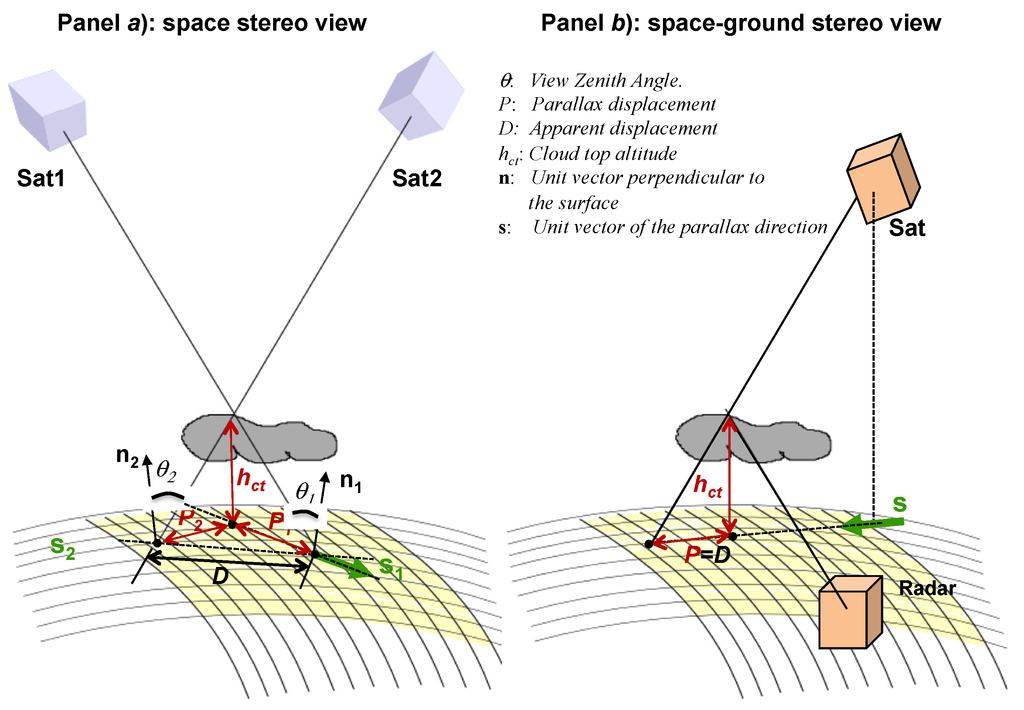 The left panel of Figure 8 (panel a) shows a general configuration with two satellite platforms observing the same cloud from different angles, while the right panel Figure 8 (panel b) shows an example of combining a ground station view and a satellite. The present study used both the configurations shown in Figure 8 for the SEVIRI-MODIS (panel a) and SEVIRI-DPX4 (panel b) nearly simultaneous acquisitions. For the more general configuration of Figure 8 (SEVIRI-MODIS), the cloud top height hct is formalised by the following equation: