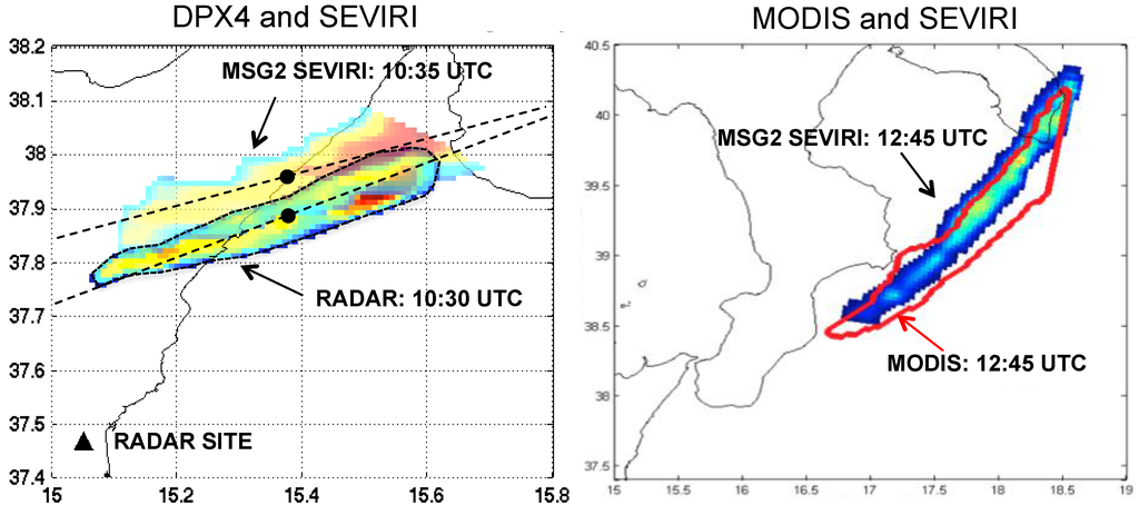 It is worth noting that although the microwave radar provides the quantity hct directly, the hct value derived by the radar might not be consistent with that derived by the infrared sensors due to their different sensitivity to particle sizes. For this reason, the radar can miss the part of the cloud with the finest particles, which presumably occupies the area above the hct derived by the radar. The net result of this could be an underestimation of the ash cloud altitude seen by the ground radar. The exploitation of the parallax approach is a way to overcome this issue by comparing the horizontal spatial patterns of the ash cloud seen by the microwave ground radar with the observations of the infrared satellite radiometers. The differing spatial pattern of the ash cloud seen by the two sensors due to their different particle size sensitivity is attenuated, because it is limited to the diluted horizontal edge of the cloud, leaving the bulk of the cloud unaffected.
