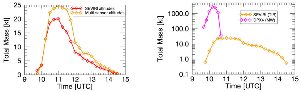 Volcanic cloud altitude is the only parameter required for the SEVIRI ash retrievals, and so, the values obtained from the parallax procedure were used to re-process the SEVIRI measurements. The improvement of the volcanic ash cloud altitude led to a mean difference between the SEVIRI ash mass, mean effective radius and mean optical depth estimated before and after the integration, of about the 30%, 10% and 20%, respectively. The comparison between the ash mass retrieved in the MW (DPX4) and in the TIR (SEVIRI) spectral range confirms that the airborne ash is a few percent (1%–2%) of the total ash emitted.