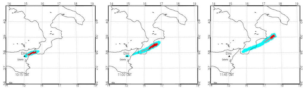 As Table 1 shows, the ash cloud was undetectable from SEVIRI measurements after 14:30 UTC, because it was too diluted. After 10:45 UTC, the ash cloud was undetectable from DPX4 because the “coarse” particles had fall out and the volcanic cloud was mainly composed of “fine” ash particles. The VIS camera data were only considered until 11:00 UTC, when the eruption stopped.