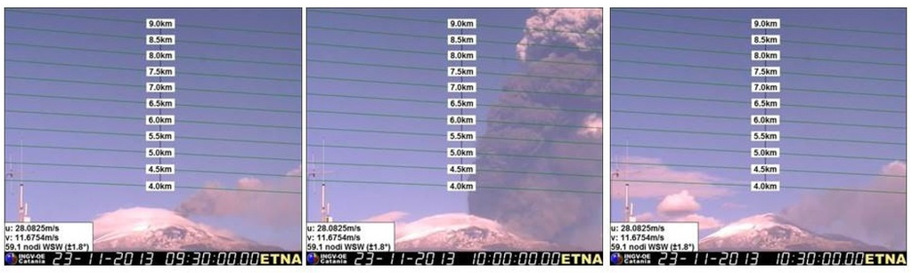 Calibrated images of the ECV camera on 23 November 2013. The images show that the column height reached 5 km, >10 km and 5 km at 9:30, 10:00 and 10:30 UTC.