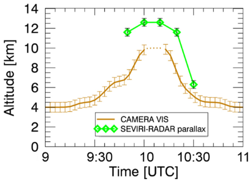 Using all of the calibrated ECV images retrieved during the paroxysmal phase, the variation in column height with time can be estimated. Figure 15 shows the variation of column height above sea level (a.s.l.) with a time step of 5 min (brown line). At about 9:15 UTC, the eruption column reached 4 ± 0.5 km. The eruptive activity began to intensify at 09:30 UTC when the eruption column rose up to 5 ± 0.5 km. After about 15 min, the column height reached the height of 6.5 ± 0.5 km. It is interesting that between 9:50 and 10:00 UTC, the eruption column rose by about 3 km in only 10 min. The ECV camera retrieved a value greater than 10.0 km a.s.l. between 10:04 and 10:10 UTC (see the dotted line). Afterwards, the activity began to markedly decrease, falling to 4.5 ± 0.5 km at 10:36 UTC until the end (about 10:55 UTC). Figure 15 also shows the volcanic cloud altitudes obtained from the SEVIRI-DPX4 parallax approach (green line). The values retrieved from the parallax measurements are generally greater compared to those obtained from the VIS camera. The reason for the discrepancy is most likely due to the vertical limitation of the camera retrieval, as stated before. Figure 14 and Figure 15 suggest that in the paroxysmal phase (until 10:20 UTC), the emissions reached an altitude of 10–12 km and then quickly decreased to around 4–6 km, causing two cloud layers at different altitudes.