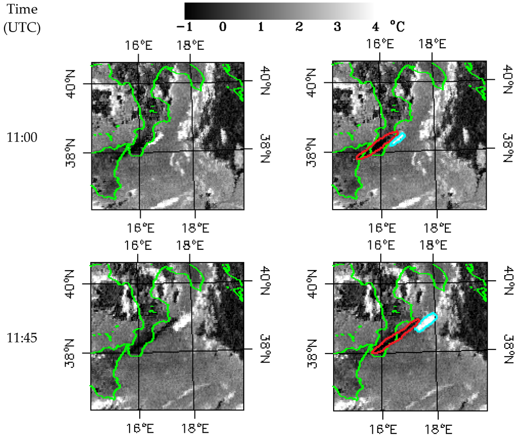 The dark pixels procedure is based on a comparison between the mean brightness temperature at 11 μm of the volcanic ash cloud’s most opaque pixels, with an atmospheric temperature profile collected near (in time and space) the area of interest. Since it is reasonable to assume that the selected pixels are not completely dark, the temperature of the cloud top is set two degrees lower [,]. A reference temperature was defined using the National Centers for Environmental Prediction (NCEP)/National Center for Atmospheric Research (NCAR) reanalysis profile [] (resolution 2.5° × 2.5°) centred on the Etna volcano and collected at 12:00 UTC.