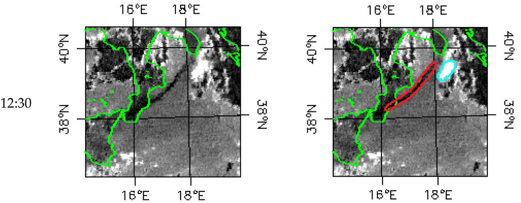 The altitude of the ice/wd volcanic cloud has been also estimated by following its centre of mass as made for the volcanic ash cloud (see Paragraph 4). The ice/wd volcanic cloud speed is estimated to be about 41 m/s that, compared to the NCEP/NCAR wind speed profile (see Figure 2), corresponding to an altitude of about 10.5 km. The volcanic ice/wd cloud altitude is also confirmed by Merucci et al. [] that estimated the altitude by using an improved method based on the parallax effect between two geostationary instruments, i.e., SEVIRI and MVIRI on board the MSG2 and MFG (Meteosat First Generation) satellites.