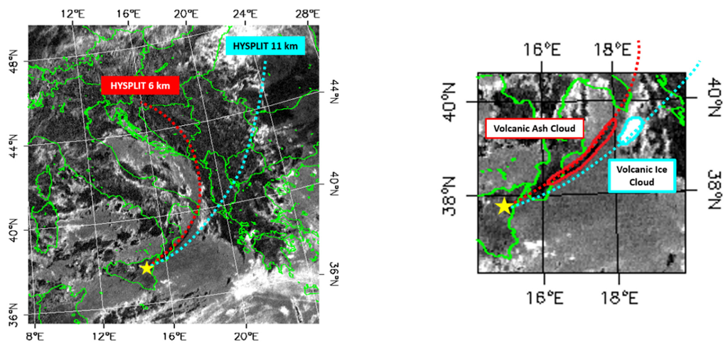 To check the possible presence of two volcanic clouds at different altitudes, the HYSPLIT forward trajectories were used. The left panel of Figure 17 shows the HYSPLIT forward trajectories from 09:00 UTC–21:00 UTC considering an emission height of 6 (red dotted line) and 11 km (cyan dotted line). The two trajectories were drawn on the SEVIRI BTD image collected at 12:30 UTC. The right panel of Figure 17 is a zoom of the left panel, focused on the area occupied by the volcanic ash and ice/wd volcanic clouds identified by red and cyan contours, respectively. This latter panel shows that the two HYSPLIT trajectories fit well with the movement of the two volcanic clouds.