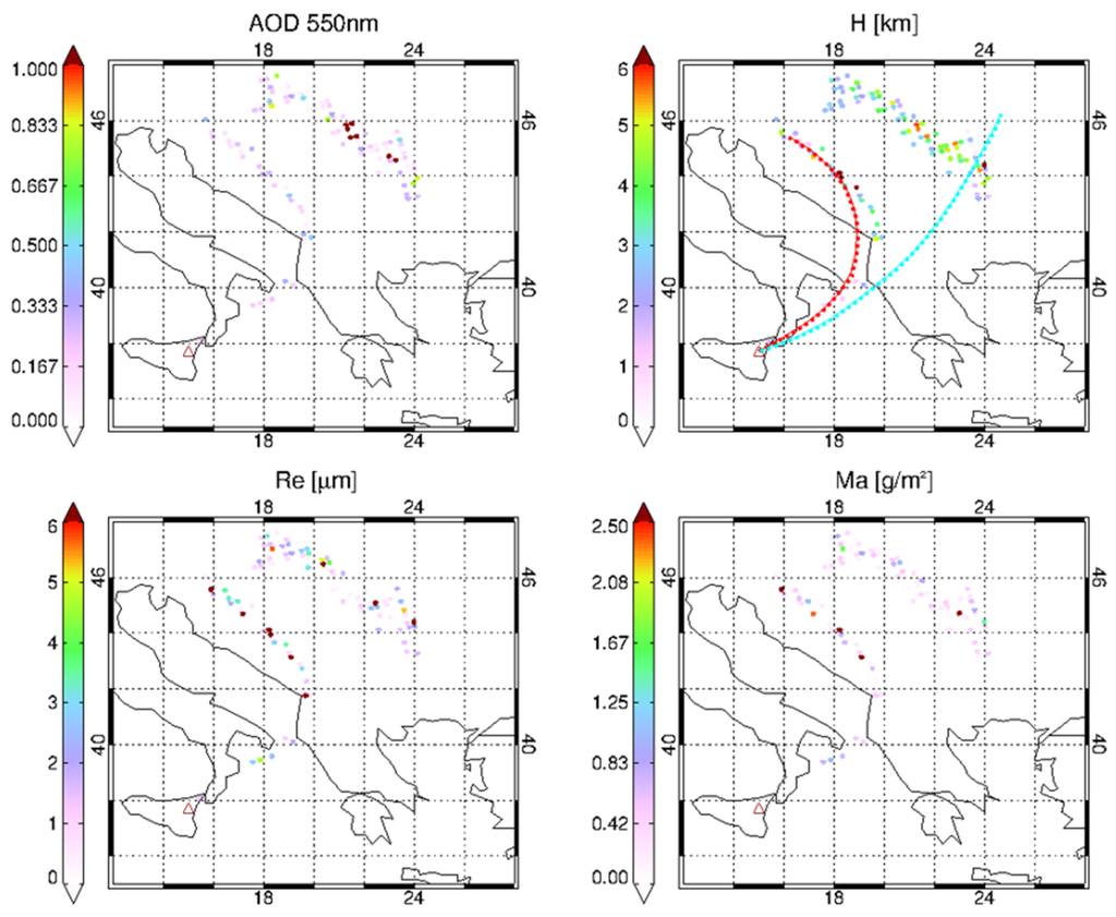 The retrieval algorithm combines an optimal estimation framework with a forward model based on RTTOV []; the clear-sky output of RTTOV is combined with an ash layer using the scheme implemented by Thomas et al. [] and Poulson et al. []. The retrieval provides probable values for ash optical depth, effective radius, plume altitude and surface temperature, and from these values, an estimate of the ash mass can also be computed.. Figure 18 shows the IASI ash retrievals (Ma, Re, AOD and hct) from the image collected at 21:00 UTC. In the right upper panel, also the HTSPLIT forward trajectories have been drawn.