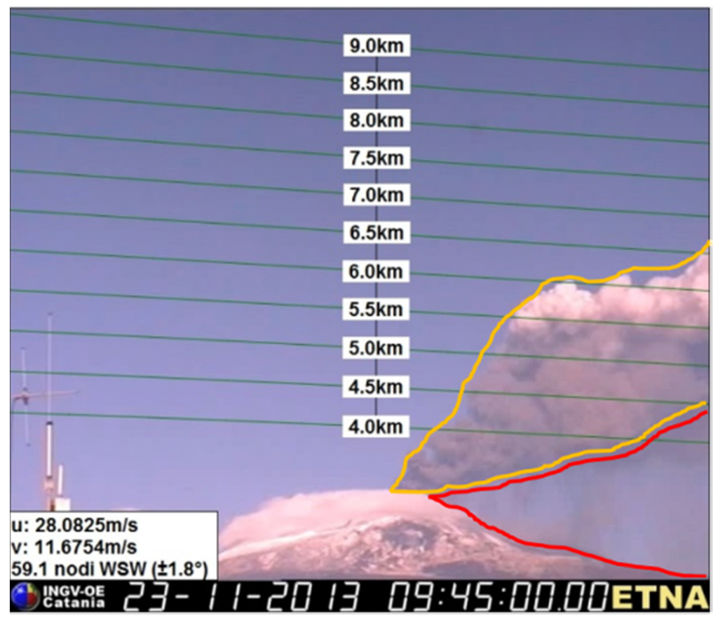 The maximum column height retrievals are limited to 9–10 km, because the current study was carried out using images from the existing video surveillance system, which that was not installed with this aim, and the portion of plume above 9–10 km is out of the field of view of the ECV camera.