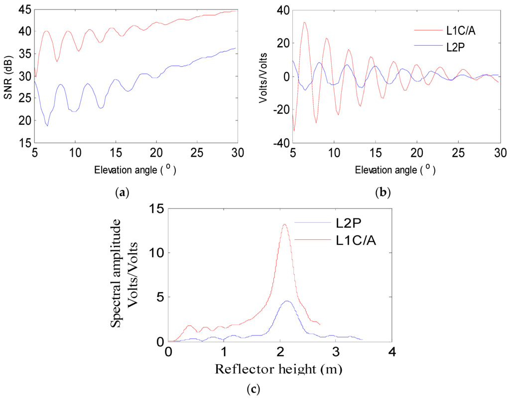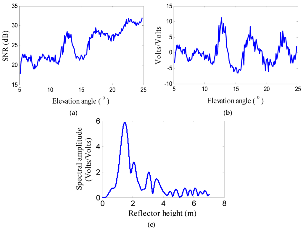 For traditional GPS applications, multipath is regarded as an error source. When direct and reflected signals are received at the same time by GPS receivers, they will interference in the antenna and cause multipath errors, which will degrade the observation accuracy in typical positioning and surveying applications. Although the reflected signal can be suppressed by the antenna gain of geodetic-quality GPS receivers, it still exists, particularly at low satellite elevation angles (5°–25°). Due to multipath effects, oscillations will appear in GPS observations (Figure 3a). The Signal to Noise Ratio (SNR) is one of the GPS observables, which has been used to assess the signal quality and noise characteristics of typical GPS surveying [20]. SNR can be calculated using the ratio of the signal power to the measurement noise. In GPS RINEX files, SNR measurements are usually denoted as S1/S2 in decibel (dB) units. It is convenient to extract the multipath effect by the SNR observable from GPS observations when compared to carrier-phase and pseudorange observables.