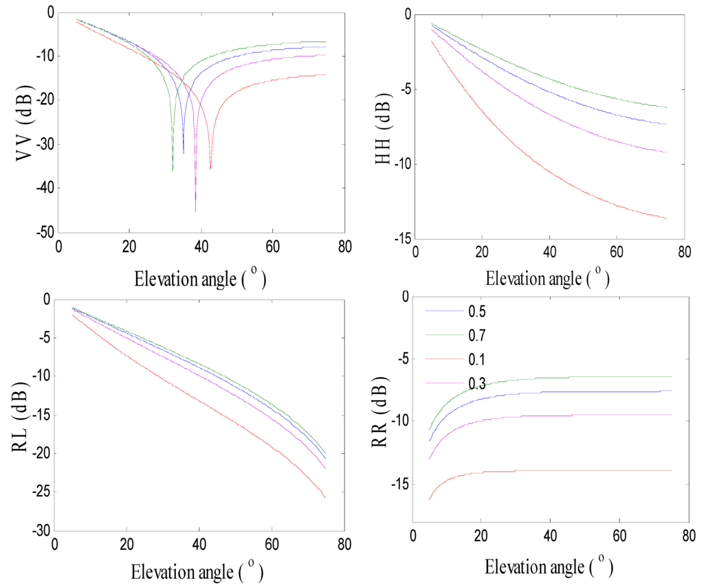 Snow density is one of the most important parameters for snow monitoring. The values can vary from 0.2 g/cm2 (new snow) to 0.9 g/cm2 (ice). In addition, the snow density is different in different stages of accumulation or melting, meaning that the composition of snow is changing. The composition will have an impact on the reflected signal and we should evaluate effects caused by the changes in snow density. When the GPS Right Hand Circular Polarized (RHCP) signal reflects from the surface, it will be changed into the Left Hand Circular Polarization (LHCP) because of the reflecting surface and geometry [9]. Therefore, the simulator presented by Nievinski and Larson [22] considers the surface reflection characteristics. The dielectric model used in the simulator is related to the density, so the coherent scattering coefficients of different snow densities at linear and circular polarizations are computed (Figure 6). In Figure 6, the VV denotes the coherent scattering coefficient with vertical transmitting and vertical receiving and the HH shows horizontal transmitting and horizontal receiving. The RR is the coherent scattering coefficient from RHCP to RHCP, which shows the RHCP signal does not change the polarization, while the RL is the scattering coefficient from RHCP to LHCP. From the simulations, the snow density has a dramatic impact on coherent scattering coefficient. With the increasing of snow density, the scattering coefficients also increase. Figure 7 presents the SNR modulations of different densities. The snow density does not affect the multipath frequency, while the amplitude has a dramatic change with different snow densities. When the density increases, the amplitude of the modulations also increases because of the increasing of the scattering coefficients.