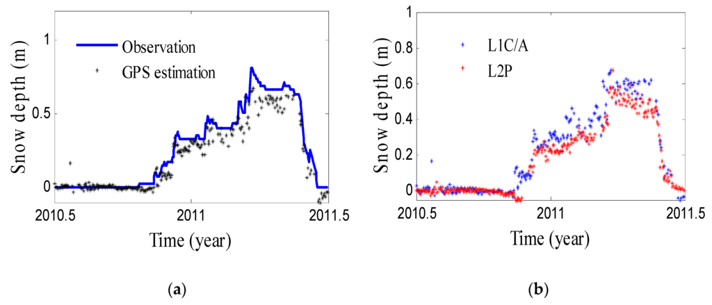 Snow is one of the most important components in the hydrological system, which impacts the water cycle and atmospheric circulation [1,2,3]. Water runoff from snowmelt is an important water resource feeding one sixth of the world population [4]. Through mentoring the snow status, we can know how much fresh water is stored by the snow. However, it is difficult to monitor snow variations because of high spatial and temporal variability. Manual and automated techniques are the main ground-based measurement [5]. Manual measurements, including snow depth and density observations, have high precision, but low temporal resolution. Compared to manual measurements, the automated techniques, e.g., sonic depth measurements, snow pillows and gamma radiation measurements, have a higher temporal resolution, but miss the information of the spatial variations on-site [5]. Due to physical reflectivity and polarization characteristics of snow surfaces with GPS-reflected signals [6,7], GPS-Reflectometry (GPS-R) can be used to monitor snow depth variations [8,9,10]. One of the benefits is that GPS-R has a high temporal and spatial resolution, and GPS observations from IGS network are permanent, continuous and freely available. Concerning the spatial resolution, the sensing footprint of the GPS-R has an area about 1000 m2 [11]. Most importantly, the current GPS network covers a large area of the world [12], which can be directly used without additional cost for snow sensing. Because of these benefits, the GPS-R will complement the traditional snow measurements [9].