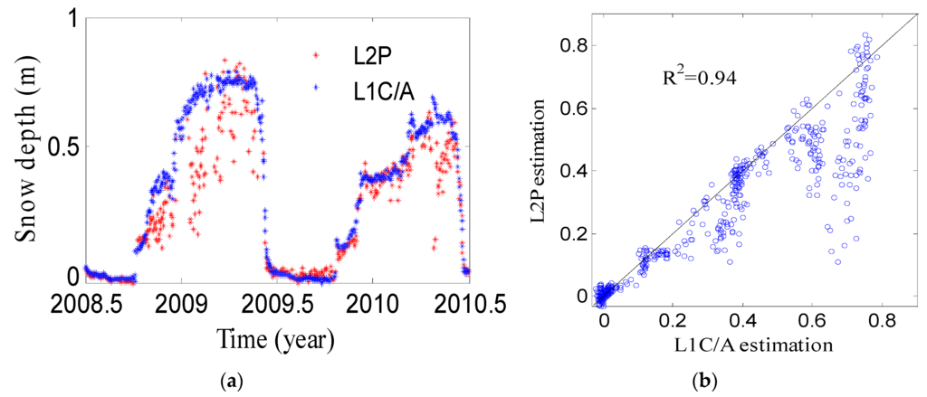Figure 10a shows the estimations from L1C/A SNR data at AB33 with a good agreement with the in situ depths. The correlation coefficient is about 0.98. In the winter of 2011, the trend is almost the same and both have a peak height in March 2011. The estimations from L1C/A is slightly higher than the L2P, but both have the same change at the same times (Figure 10b). The correlation coefficient is about 0.97 with a RMSE of 0.07 m, which means that there are no significant differences between L1C/A and L2P estimations. Figure 11 shows the comparison of L1C/A and L2P results at AB39. The L1C/A estimation has a correlation of 0.94 with in situ data, indicating a good agreement. The correlation of L1C/A and L2P results is 0.93. Figure 12 show the comparison of L1C/A and L2P results at SG27, which has a correlation of 0.94 and a RMSE of 0.11 m.