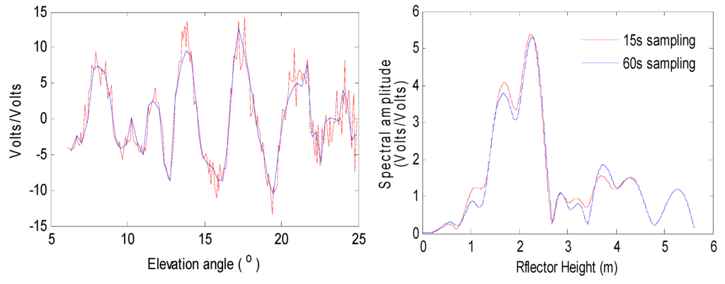 where dSNR is the detrended SNR, A is the amplitude, H is the reflector height, λ is the GPS carrier wavelength, e is the satellite elevation angle and φ is the phase. In order to remove the direct trend, a low-order polynomial is used to fit the SNR measurements. Before fitting the measurements, we convert the dB scale into a linear scale, such as volts for the reason of linearity, using the equation: . From Figure 3b, we can clearly see the modulations in the SNR time series. The detrended SNR signal can be modeled following Equation (2). This equation provides the multipath modulation frequency at a constant of sinus of elevation angle e. Through Equation (2), we can derive the relation between the reflector height and the multipath modulation frequency