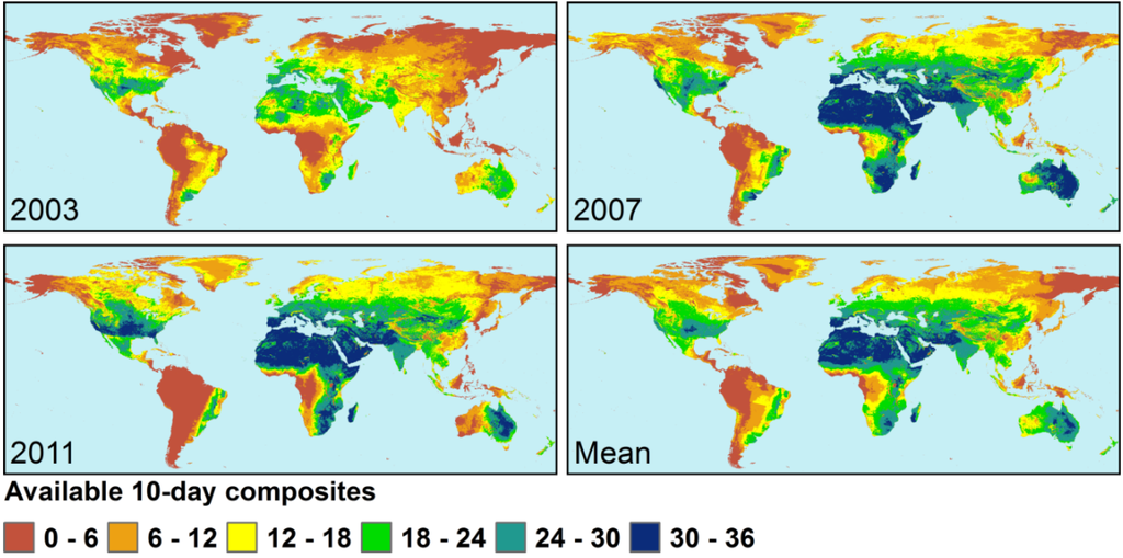 The HA algorithm was originally developed to analyze time series without larger gaps. However, MERIS-FR-based LAI time series can have large data gaps. Thus, a criterion had to be implemented to fill these. Depending on the latitude of the pixel, large and systematic data gaps are mainly caused by the acquisition strategy. As an example, optical remote sensing in the high latitudes is impossible during polar winter. Other large data gaps are due to the intermittent data reception of MERIS-FR data, because only MERIS-FR data or ASAR data could be downlinked. Smaller gaps might be caused by clouds, illumination conditions or sensor errors. Figure 2 shows the number of available 10-day composites for selected years (2003, 2007 and 2011) and the mean value for the period 2003–2011. Especially for South America, the Tropic Zone (clouds), West Australia (acquisition) and wide areas of the Boreal zone (illumination, clouds), only a few composites are available. On the contrary, for the U.S., Europe, North Africa, Arabia, the Indian peninsula and East Australia, good coverage can be seen.