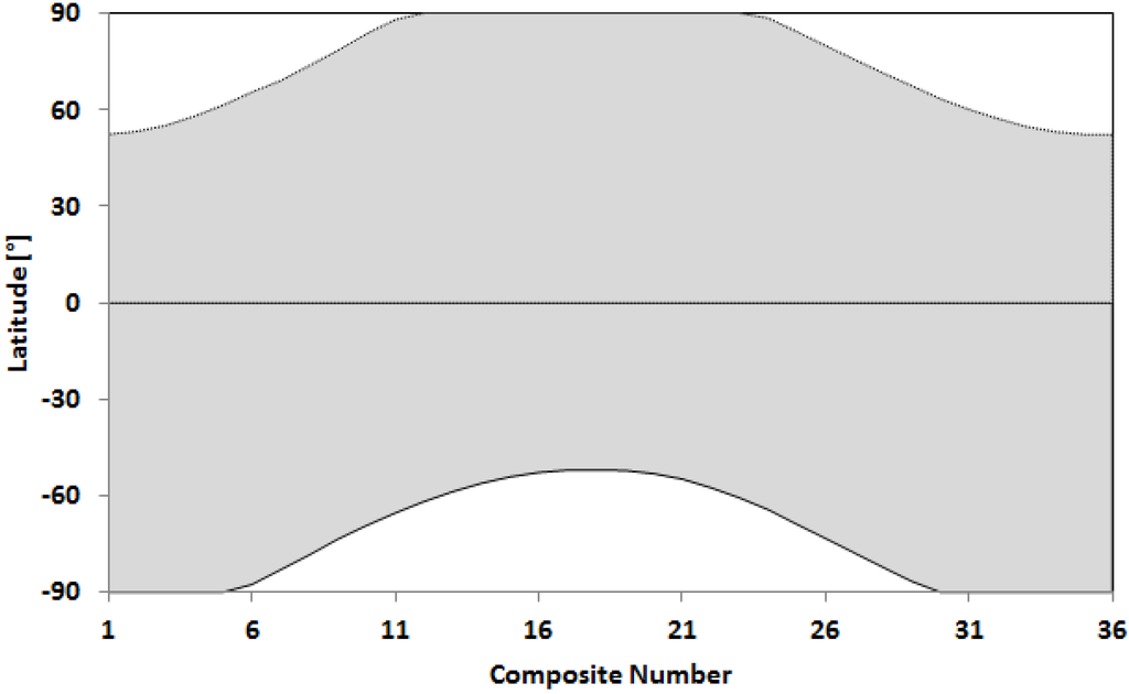 The original HA setup implies the criterion that for all grid cells, a time series with the same length needs to be approximated. However, vegetation activity is strongly dependent on the geographical location. In addition, optical remote sensing imagery, derived in unfavorable conditions, especially at too high solar zenith angles (e.g., >80°), are difficult to interpret and are likely to contain errors, because of shading effects. Since the ENVISAT MERIS acquisition time was at approximately 10 a.m. local time, we calculated for each 10-day composite the maximum and minimum latitude at which the solar zenith angle is higher than 80° at 10 a.m. (see Figure 3), following the approach of [70]. For each pixel, we checked how many possible observations were available and shortened the maximum time series length accordingly. As an example: the vegetation phase at 75°N was shortened from 36 (365 days) to 18 (184 days) composites, because observations were only possible between Composites 9 (21–31 March) and 26 (11–20 September). In this case, Composites 1–8 and 27–36 were set to LAI = 0.0.
