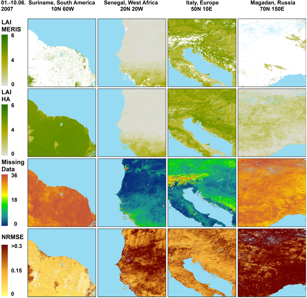 Four exemplary results of 10° × 10° snapshots representative for Composite 16 (1–10 July) 2007, are presented in Figure 4. The examples are chosen to show major climatic zones, like the tropics (Suriname), sub-tropics and desert (Senegal), Mediterranean (Italy) and tundra (Magadan). As can be seen, after HA is applied, all missing values (top row) are filled (second row). In order to give information on the quality of our results, Figure 4 also contains the amount of missing values per pixel (third row). As an example, the gap filling procedure for the Italy tile was applied for 29% of all pixels, from which 63% contained gaps of up to seven missing values and 12% of more than 18, which mainly occur in mountainous regions (yellow to red areas).