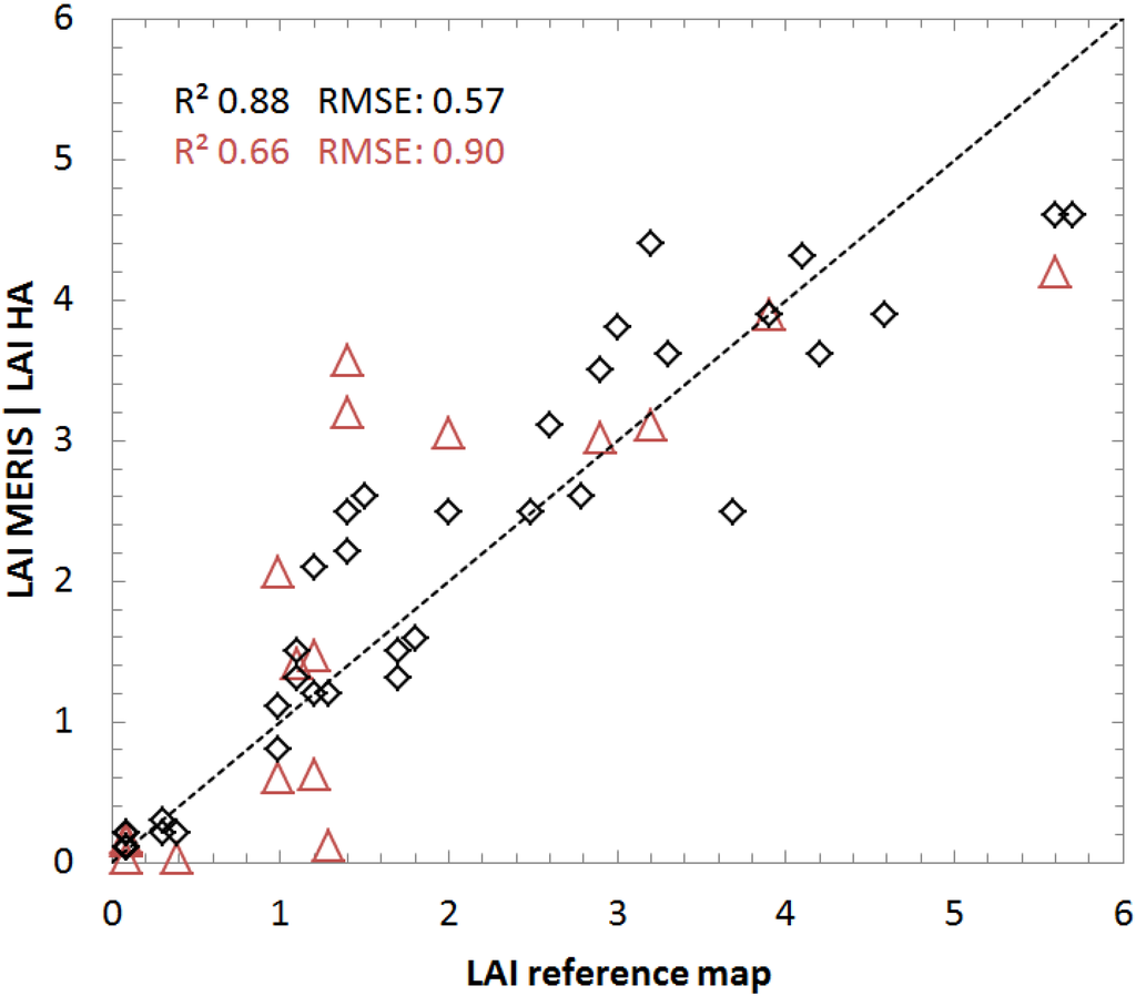 Validation of time series-analyzed MERIS data with VALERI and BigFoot measurements. Red triangles represent the comparison of Leaf Area Index (LAI) MERIS with LAI reference maps. Black diamonds represent the comparison of LAI harmonic analysis (HA) with LAI reference maps.