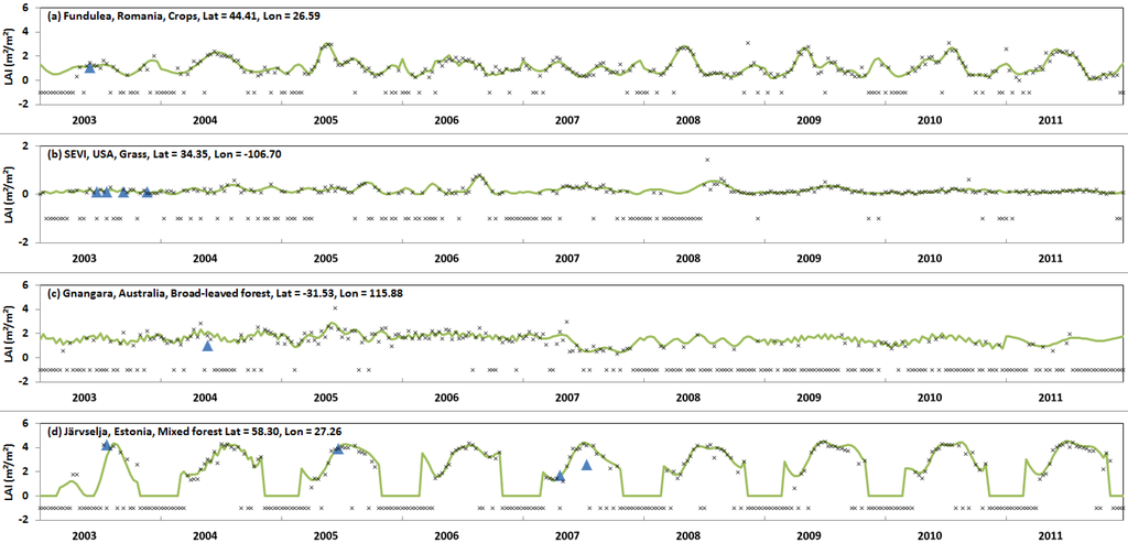 Temporal development of the original MERIS (black crosses), processed (green solid line) and BigFoot/VALERI (blue Triangles) data for the period 2003–2011, for: (a) Fundulea (crops); (b) SEVI (grass); (c) Gnangara (broad-leaved forest); (d) Järvselja (mixed forest). Negative values (−1) represent missing observations.