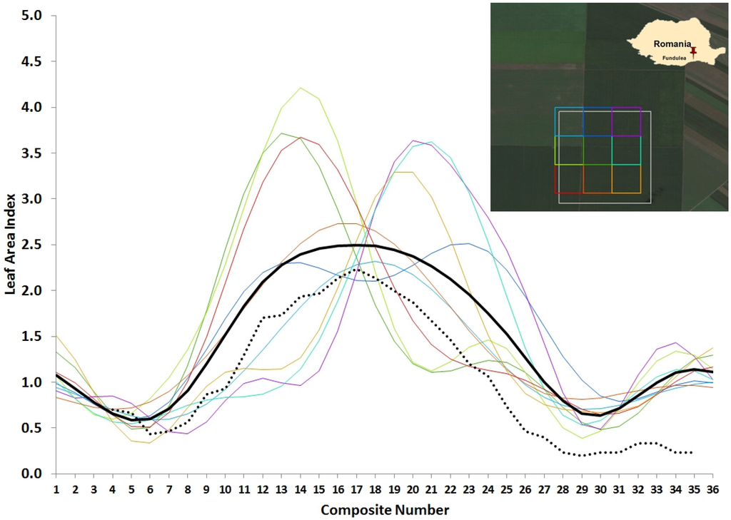 Leaf Area Index inter-comparison of nine MERIS-LAI-HA and the corresponding Geoland2-SPOT-VGT-LAI at the Fundulea, Romania (crops), site for 2004. Top right: RGB image (Google Earth) of the Fundulea area with: grey rectangles, SPOT 1 km × 1 km pixel; colored rectangles, MERIS pixels. Graph: each colored line corresponds to the rectangle with the same color. Bold black line, average LAI of all nine colored LAI lines; dashed line, SPOT-VEGETATION LAI.