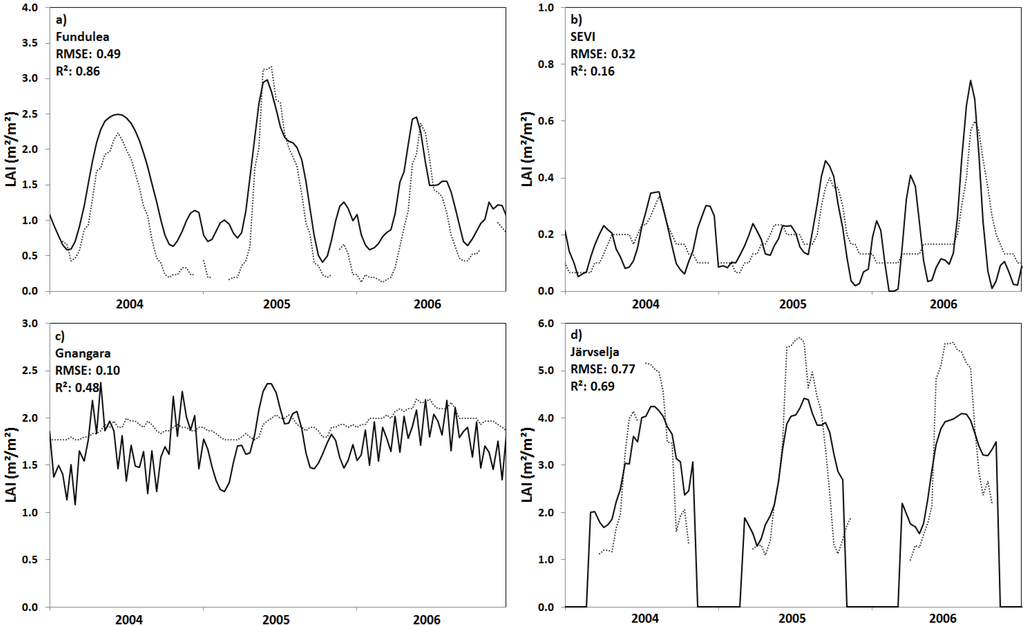 Finally, we performed an inter-comparison between Geoland2 LAI products based on 1 km SPOT-VGT data and our new MERIS-FR-LAI products for the four test sites shown in Figure 6. We resampled the MERIS-FR-LAI product by averaging nine MERIS-FR pixels, which corresponds to the SPOT-VGT pixel. An exemplary result for the period 2004–2006 for the four sites, Fundulea, SEVI, Gnangara and Järvselja, is presented in Figure 8. It can be seen that for all four sites, both LAIs follow similar temporal trajectories. The strongest agreement (R2: 0.86) can be found for the agricultural site Fundulea (Figure 8a; also see Figure 7), followed by the mixed forest site (Järvselja; Figure 8d). However, for the mixed forest site, the temporal LAI profiles show differences in their magnitude, which result in an increased RMSE (0.77). For the evergreen broad-leaved forest site (Gnangara; Figure 8c), our gap-filling and smoothing approach (harmonic analysis) results in small amplitude (±0.1), but high frequency oscillations, when a close to constant LAI is approximated. This results in a low R2 of only 0.48, but combined with the very small RMSE of 0.10, the overall agreement is still given. For the desert grassland/shrub land site (SEVI; Figure 8b), the agreement between SPOT-VGT LAI and the MERIS-LAI is low (R2: 0.16). The SEVI site consists largely of perennial bunchgrass, with small amounts of cacti and shrubs. However, this finding is due to very low LAIs (<0.5) for most estimates of the time series. Historic field measurements [35] also published low LAI measurements demonstrating that the relative standard deviation of LAI field measurements in the SEVI area can be up to 60%. This is confirmed by [74], who showed large discrepancies between different ground-based LAI measurements for heterogeneous and short crop canopies due to the substantial differences in the spatial sampling of transmittance (up to RMSE of 0.16). For shrub and grass land, at least the same error for the LAI measurements is expected, as well as for remote sensing-derived LAI products. Overall, the MERIS-FR LAI pattern generally follows the Geoland2-SPOT-VEGETATION-based LAI time series for all test sites.