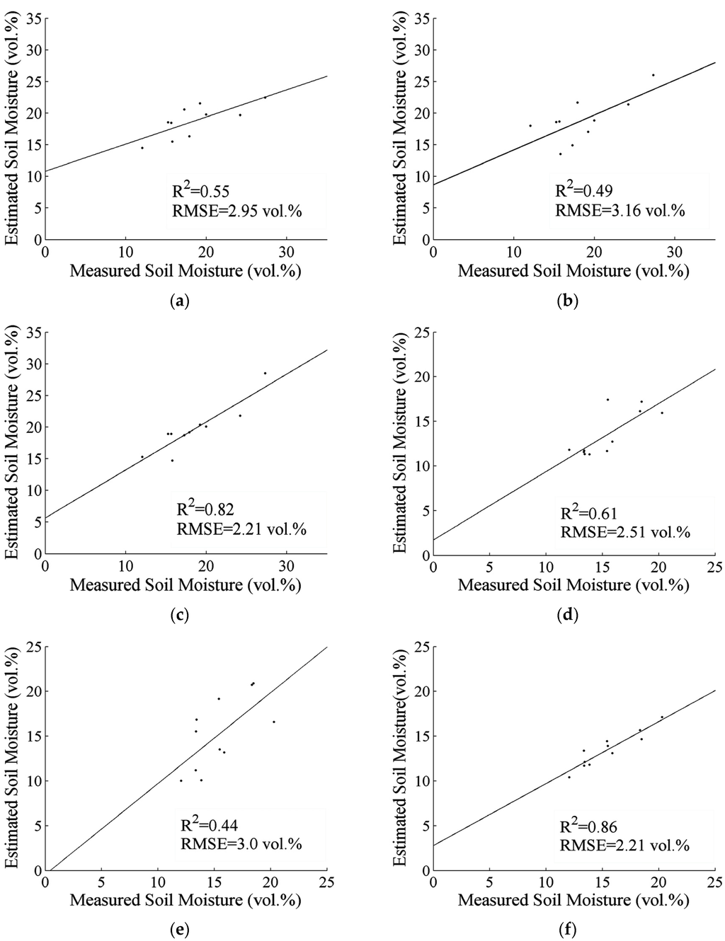 Comparisons between the measured and estimated soil moisture content using the SVR model: (a) Jiulong data set with TerraSAR-X (R2 = 0.55, RMSE = 2.95 vol %); (b) Jiulong data set with Radarsat-2 (R2 = 0.49, RMSE = 3.16 vol %); (c) Jiulong data set with TerraSAR-X and Radarsat-2 (R2 = 0.82, RMSE = 2.21 vol %); (d) Wannian data set with TerraSAR-X (R2 = 0.61, RMSE = 2.51 vol %); (e) Wannian data set with Radarsat-2 (R2 = 0.44, RMSE = 3.0 vol %); and (f) Wannian data set with TerraSAR-X and Radarsat-2 (R2 = 0.86, RMSE = 2.21 vol %).