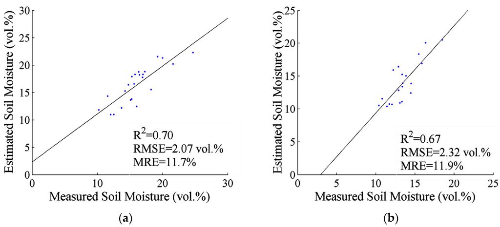 Comparisons between the measured and estimated soil moisture content using modified Dubois model: (a) Jiulong experimental area (R2 = 0.70, RMSE = 2.07 vol %); (b) Wannian experimental area (R2 = 0.67, RMSE = 2.32 vol %).