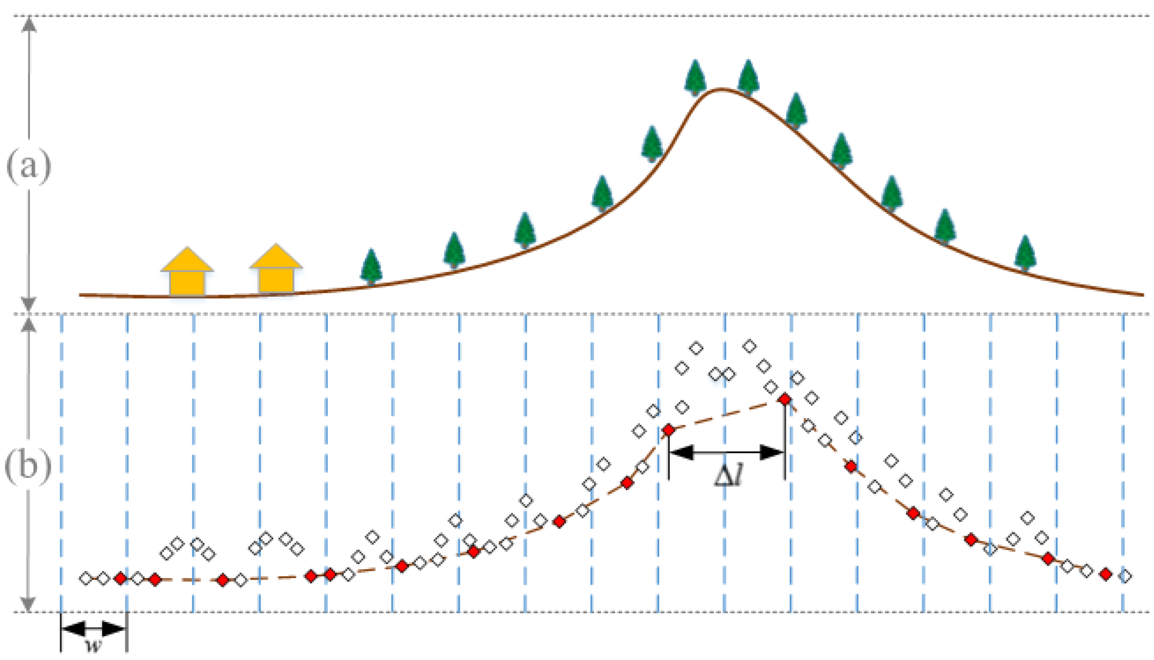 In the classic PTD algorithm, the parameter of grid cell size , for seed point selection has a significant effect on the filtering results. As shown in Figure 1, should typically be set larger than the maximum building size to avoid selecting seed points on the roof of buildings. However, given that the lowest point in the grid is selected as the seed point, the selected seed points hardly appear in the vicinity of the mountain ridge. Thus, completely preserving the real terrain at the ridge could be difficult during the subsequent TIN densification process. If some points near the ridge could be detected and used as additional seed points, the filtering results for mountainous areas will be improved.