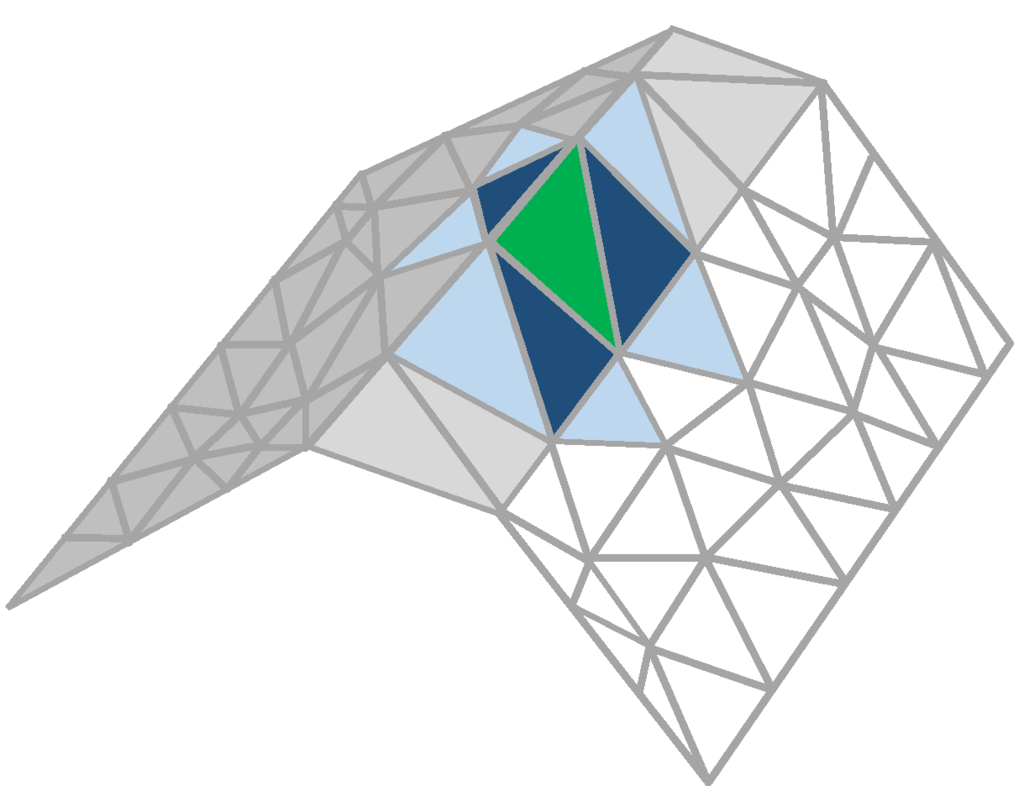 Adjacent triangles for determining the ridge triangle. The green triangle represents the judging triangle, the dark blue triangles represent the triangles directly adjacent to the judging triangle, and the light blue triangles represent the triangles connected to the directly adjacent triangles.
