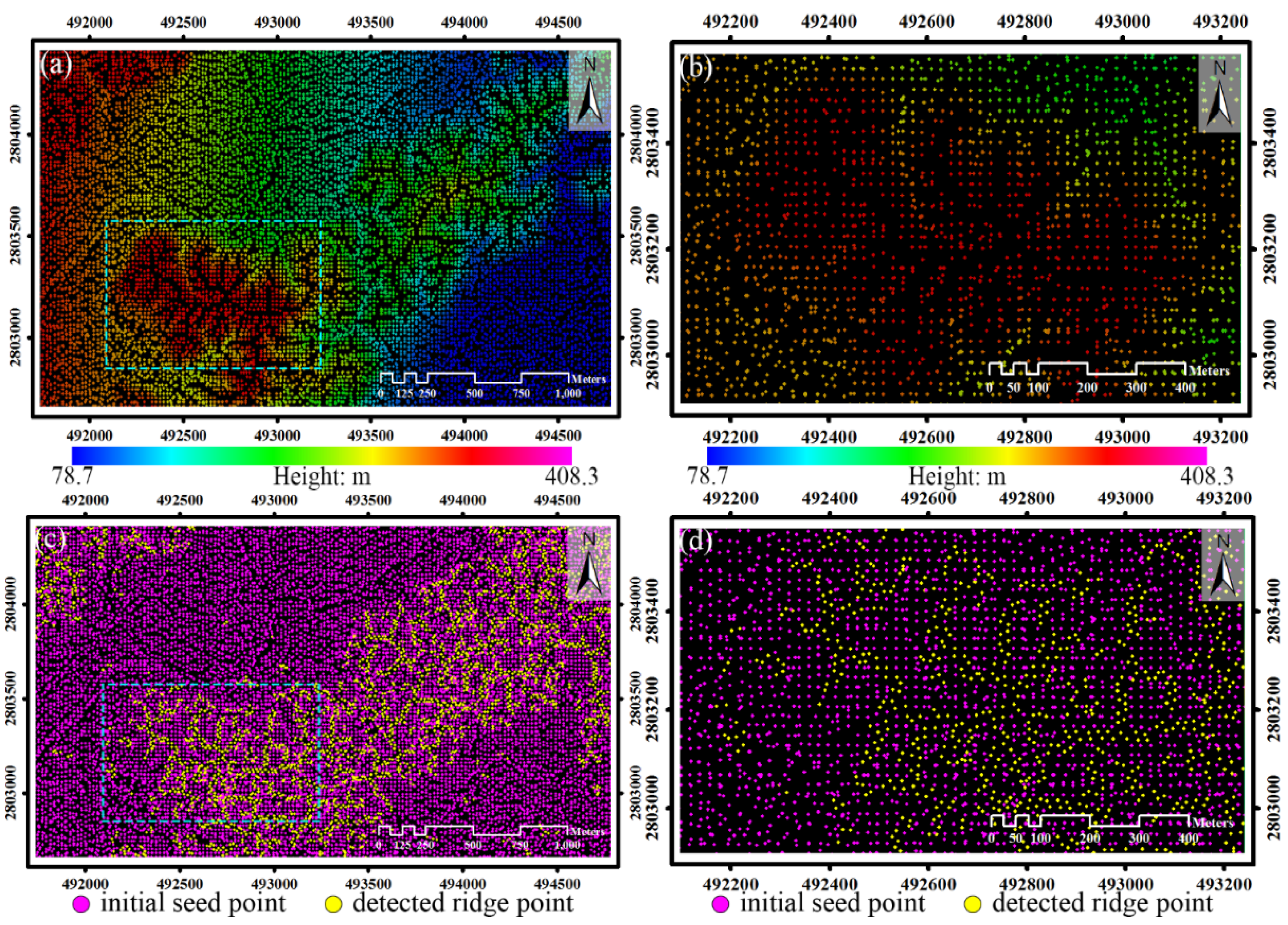 A major effect of the optimized selection for seed points is that the grid cell size can be assigned to a larger range. According to the authors’ experience, can generally be set to half of the value adopted in the classic PTD algorithm. Figure 4 shows the optimal selected results of the seed points. After optimization, the gross errors among the initial seed points and the ridge points are both well eliminated, whereas most of the additional ridge points are preserved.