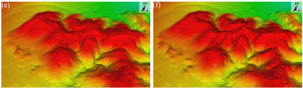 In summary, when a triangle in the sparse TIN satisfies Assumptions (1) and (2), it can be detected as a ridge triangle. In general, the terrain is usually not flat at the ridge, which means that large artificial objects rarely exist therein. Therefore, in our approach, the lowest point within a radius of 2 m from the gravity center of the triangle is selected as the ridge point. Figure 3 shows the results of the ridge point detection for one of the experimental datasets in our approach. Figure 3a,b illustrate obvious gaps along the ridge line; these gaps are clearly caused by the descending trend of the ridge terrain. Figure 3c,d show that, in most of the gaps, the potential ridge points can be detected by the proposed method. Figure 3e,f indicate that the terrain surface constructed with the initial seed points and the ridge points preserves the topographic features more precisely.
