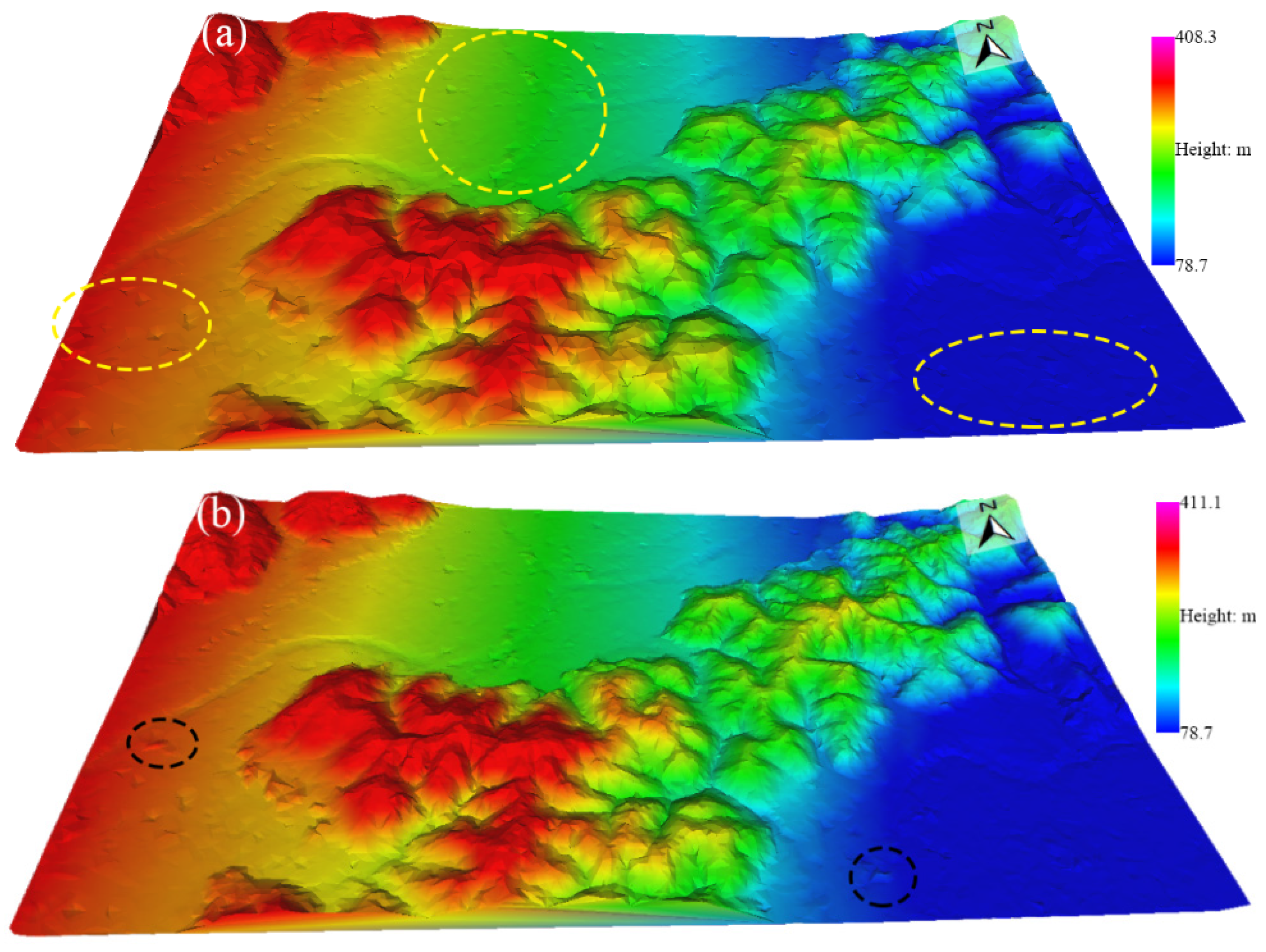 Among the filtering results, we select a mountain site and a residential site from the two datasets to perform a visual evaluation. The selected sites include Sites 1, 4, 6, and 7. Figure 7, Figure 8, Figure 9 and Figure 10 show the comparative results of the generated DTMs for these sites. Figure 7 and Figure 9 indicate that the problems of PM, MC and LP lie in the acceptance of obvious objects as terrains. Figure 8 and Figure 10 indicate that more points near the mountain ridge are rejected by PM and PTD. The proposed method achieves a better overall performance on the two different types of terrain.