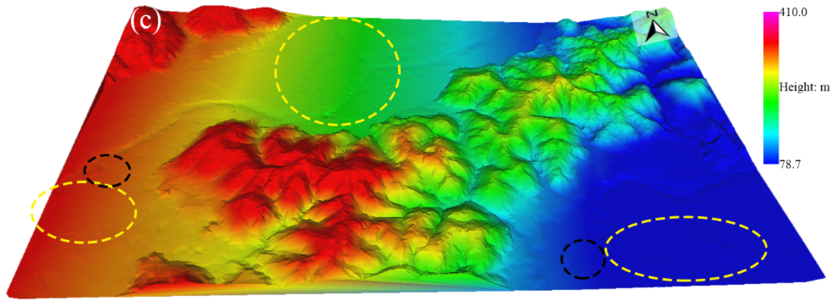 Triangulated irregular network (TIN) surfaces constructed with seed points before and after optimal selection. (a) Results of the initial seed points; (b) Results of the seed points after adding the detected ridge points; (c) Results of the seed points after optimal selection. The yellow ellipses indicate the areas where gross errors among the initial seed points appear, and the black ellipses indicate the areas where gross errors among additional ridge points appear.