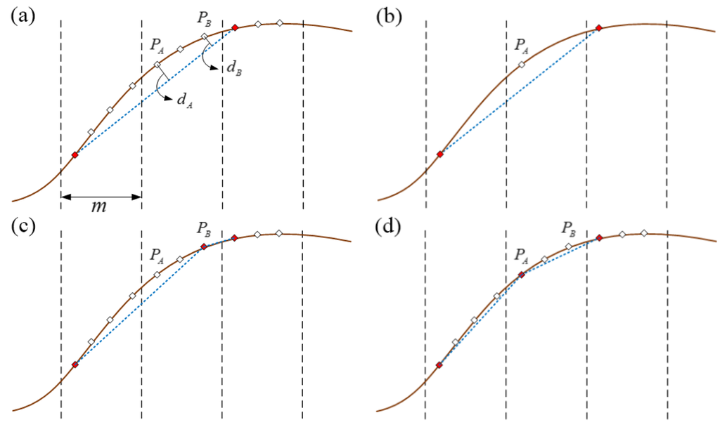 Example of TIN densification in a local area. The brown line represents the actual terrain, and the blue dashed line represents the TIN surface constructed with the detected terrain points. The red diamond shapes represent the points labeled as terrain points, and the white diamonds represent the points labeled as off-terrain points. (a) Sectional view of the original point cloud, where and are the distances from and to the corresponding triangle, respectively, and is the grid cell size for determining the lowest point; (b) cannot be labeled as a terrain point if the points are subsampled in advance; (c,d) Densification results using the proposed strategy in two iterations, where is successfully labeled.