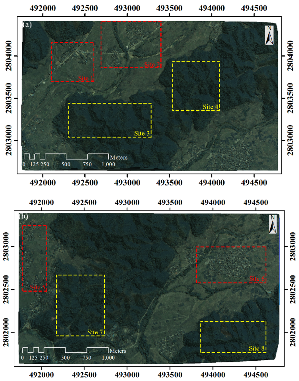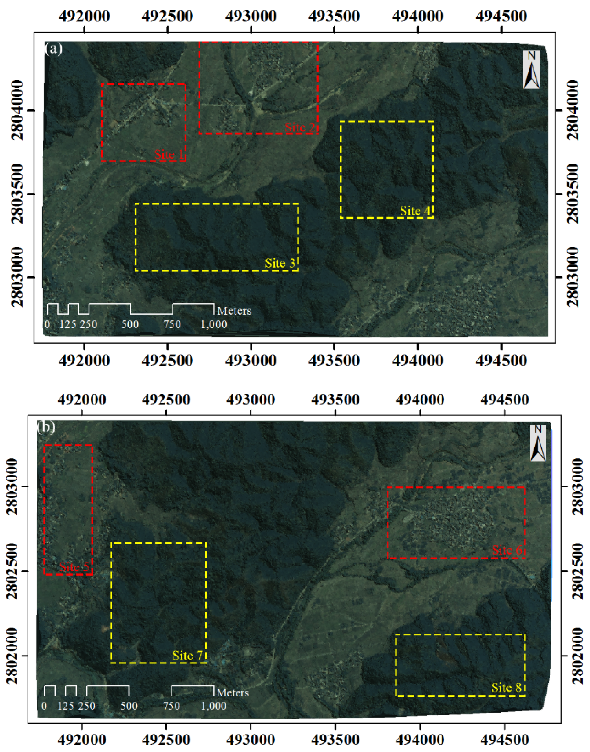 In the datasets, eight sites are selected to evaluate the filtering results, including four residential sites and four mountainous sites. Figure 6 shows the experimental and evaluation areas in the coordinate system of the 1984 World Geodetic System. Given that the ground truth data are unavailable in the testing area, TerraScan software is adopted to classify the points of each site into terrain and off-terrain points by careful manual editing. The obtained ground points are interpolated into a regular-grid DTM, which is then used as a reference DTM.