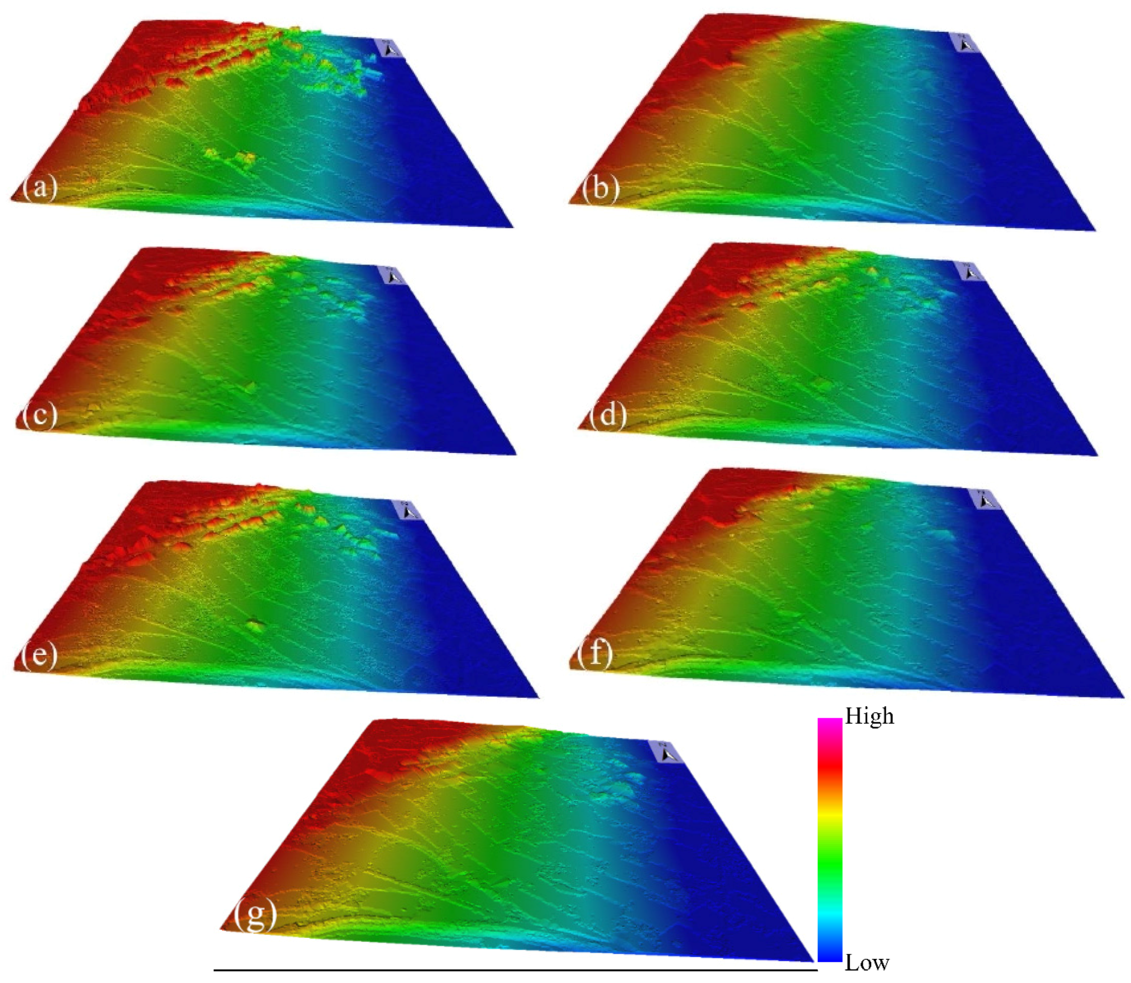 TIN surfaces constructed with the points of Site 1 and its filtering results. (a) Original stereo-matched point cloud; (b) Reference DTM obtained from manual editing; (c–g) Filtering results of PM, MC, LP, PTD and the proposed method, respectively.